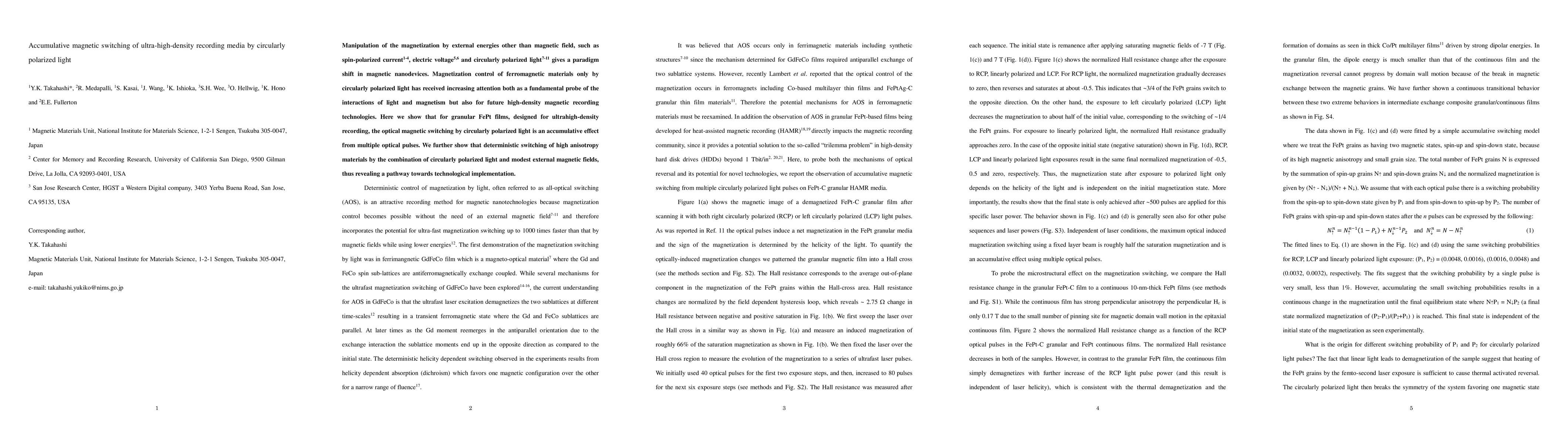This paper demonstrates that magnetization in granular FePt films can be switched by the accumulative effect of multiple pulses of circularly polarized light, highlighting its potential for ultra-high-density magnetic recording. It also shows that combining this optical method with modest external magnetic fields can achieve deterministic switching, paving the way for future technological applications.