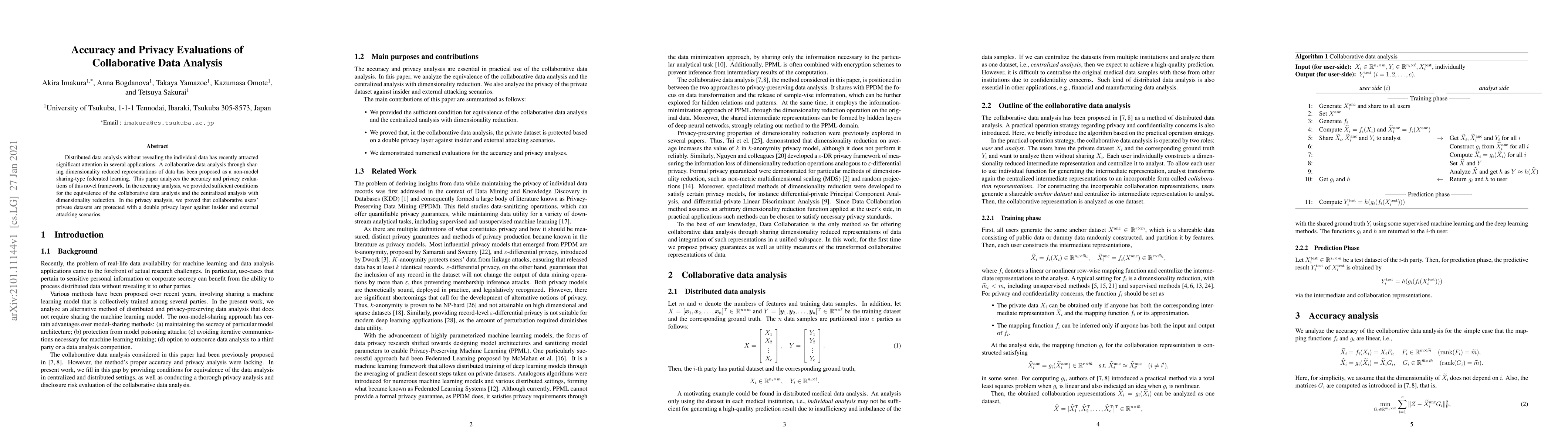 This paper evaluates the accuracy and privacy of a collaborative data analysis framework that shares dimensionality reduced representations without revealing individual data. It finds that this method provides double protection against insider and external attacks while maintaining accuracy with centralized analysis.