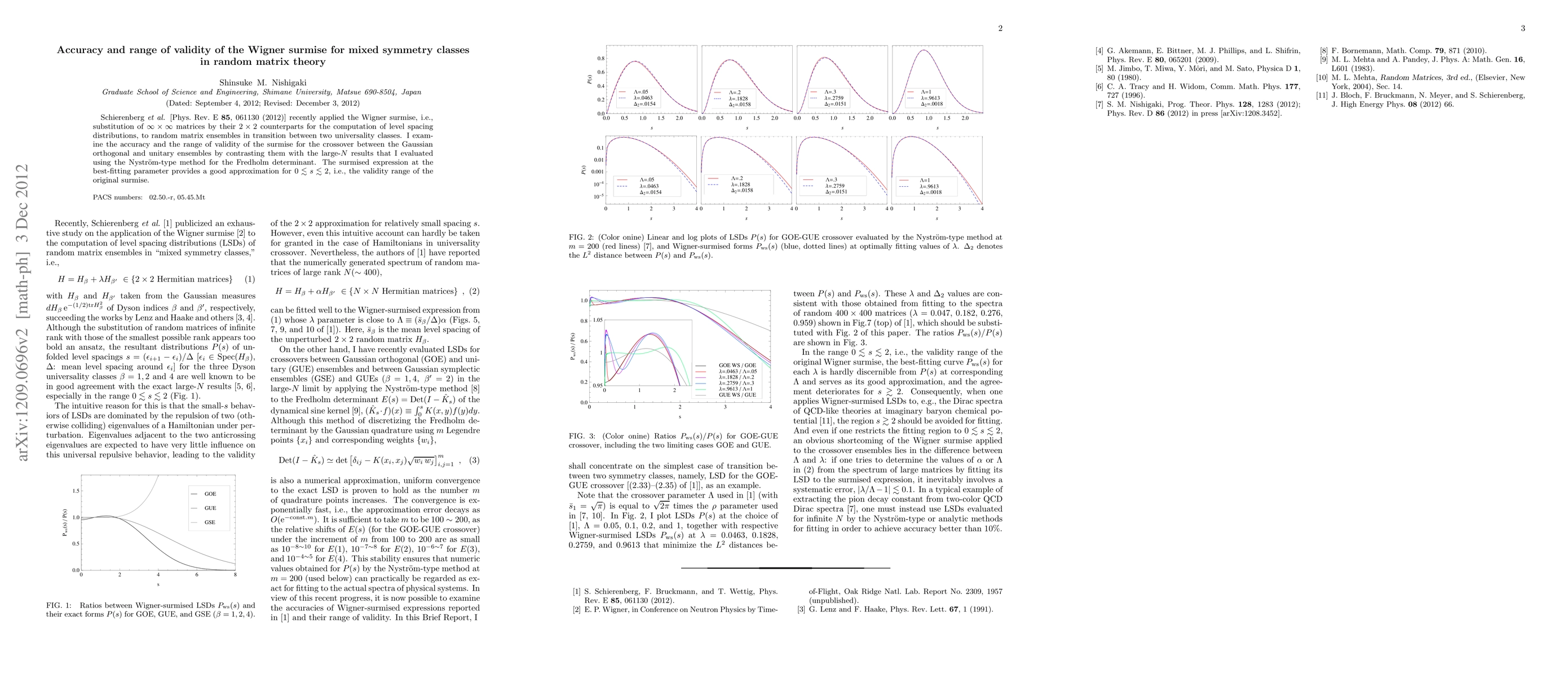 This paper investigates the accuracy and range of validity of the Wigner surmise for mixed symmetry classes in random matrix theory, finding that the surmise provides a good approximation for level spacing distributions in the crossover between Gaussian orthogonal and unitary ensembles, particularly for 0 ≤ s ≤ 2. The results are compared with large-N evaluations using the Nystrom-type method for the Fredholm determinant.
