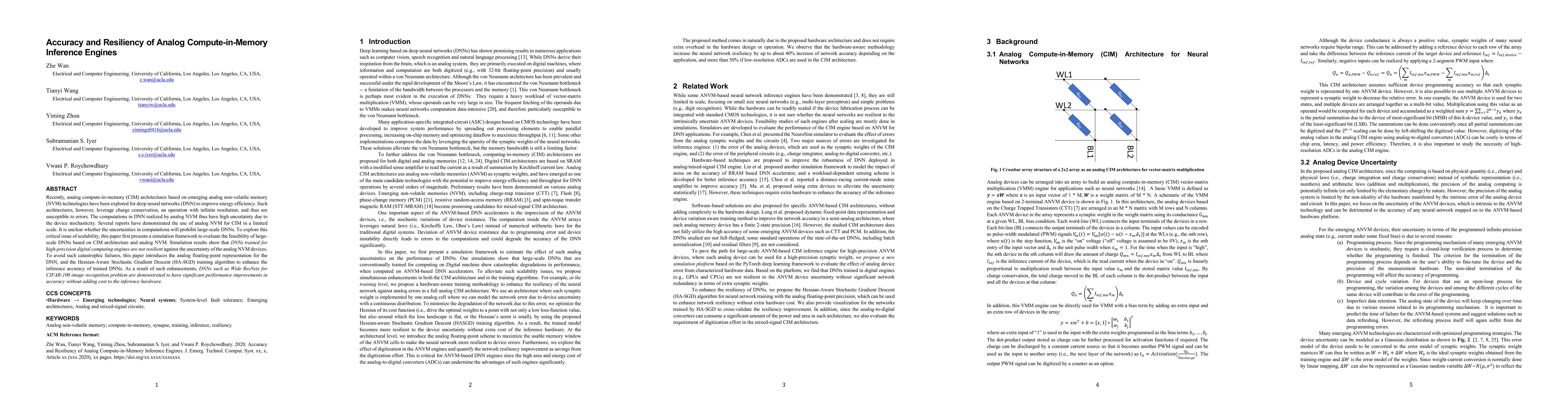 This paper investigates the accuracy and scalability of deep neural networks (DNNs) using analog compute-in-memory (CIM) architectures based on analog non-volatile memory. It finds that existing DNNs struggle with the uncertainties of analog devices, but introduces an analog floating-point representation and a Hessian-Aware Stochastic Gradient Descent algorithm to significantly improve DNN accuracy in CIM without additional hardware costs.