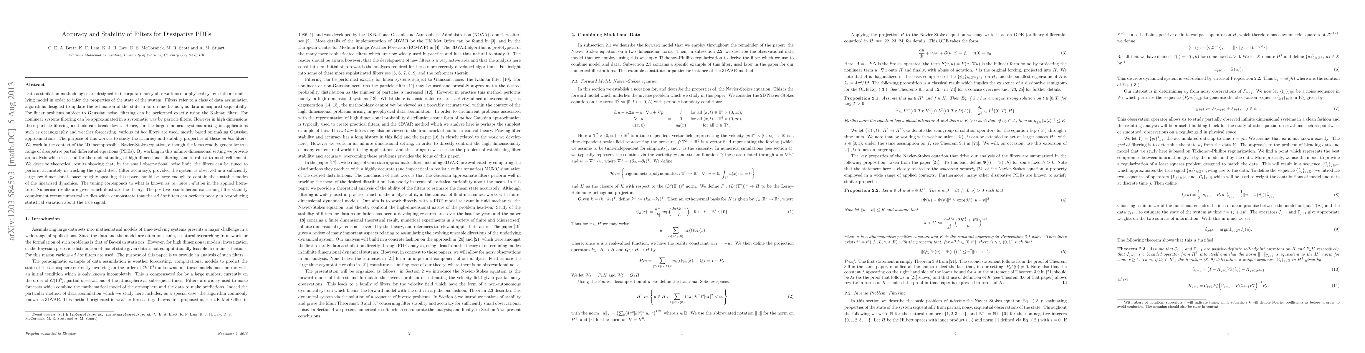 Data assimilation methodologies are designed to incorporate noisy observations of a physical system into an underlying model in order to infer the properties of the state of the system. Filters refer to a class of data assimilation algorithms designed to update the estimation of the state as data is acquired sequentially. For linear problems subject to Gaussian noise filtering can be performed exactly using the Kalman filter. For nonlinear systems it can be approximated in a systematic way by particle filters. However in high dimensions these particle filtering methods can break down. Hence, for the large nonlinear systems arising in applications such as oceanography and weather forecasting, various ad hoc filters are used, based on Gaussian approximations. In this work, we study the accuracy and stability of these ad hoc filters in the context of the 2D incompressible Navier-Stokes equation. The ideas readily generalize to a range of dissipative partial differential equations (PDEs). By working in this infinite dimensional setting we provide an analysis which is useful for the understanding of high dimensional filtering, and is robust to mesh-refinement. We describe theoretical results showing that, in the small observational noise limit, the filters can be tuned to perform accurately in tracking the signal itself (filter accuracy), provided the system is observed in a sufficiently large low dimensional space; roughly speaking this space should be large enough to contain the unstable modes of the linearized dynamics. The tuning corresponds to what is known as variance inflation in the applied literature. Numerical results are given which illustrate the theory. The positive results herein concerning filter stability complement recent numerical studies which demonstrate that the ad hoc filters can perform poorly in reproducing statistical variation about the true signal.