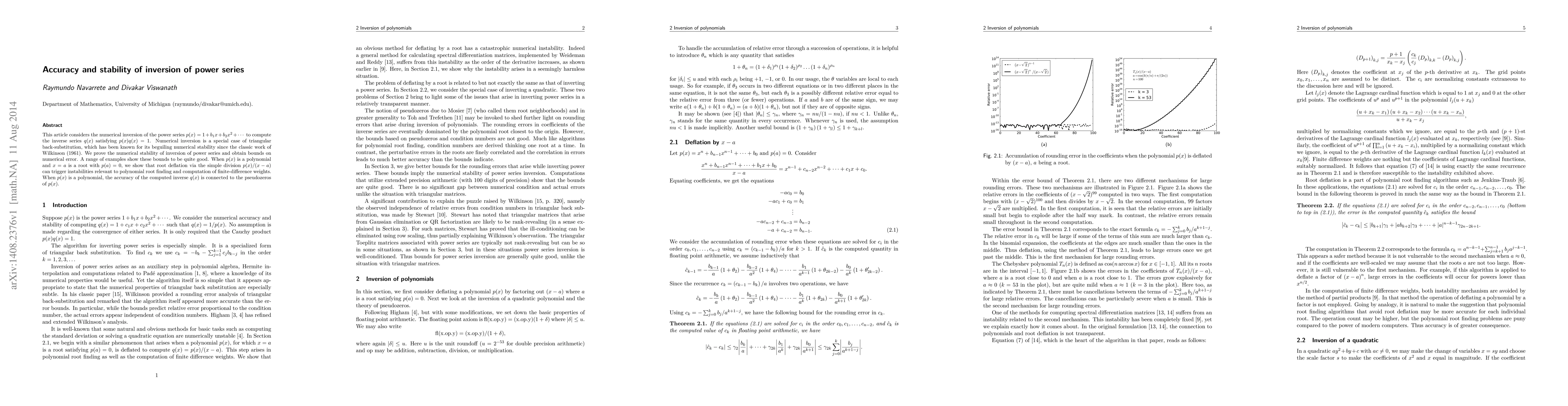 This article considers the numerical inversion of the power series $p(x)=1+b_{1}x+b_{2}x^{2}+\cdots$ to compute the inverse series $q(x)$ satisfying $p(x)q(x)=1$. Numerical inversion is a special case of triangular back-substitution, which has been known for its beguiling numerical stability since the classic work of Wilkinson (1961). We prove the numerical stability of inversion of power series and obtain bounds on numerical error. A range of examples show these bounds to be quite good. When $p(x)$ is a polynomial and $x=a$ is a root with $p(a)=0$, we show that root deflation via the simple division $p(x)/(x-a)$ can trigger instabilities relevant to polynomial root finding and computation of finite-difference weights. When $p(x)$ is a polynomial, the accuracy of the computed inverse $q(x)$ is connected to the pseudozeros of $p(x)$.