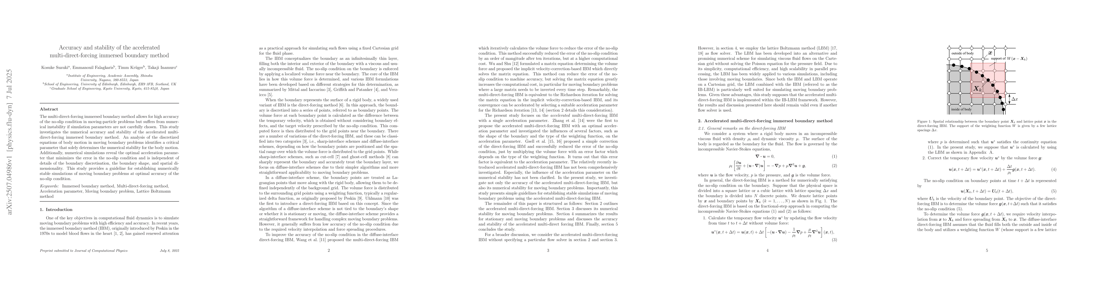 This research pinpoints a critical parameter ensuring numerical stability in the accelerated multi-direct-forcing immersed boundary method, crucial for moving-particle problems. It also identifies an optimal acceleration parameter minimizing error in no-slip condition, applicable across various boundary shapes and dimensions, thus guiding stable simulations.
