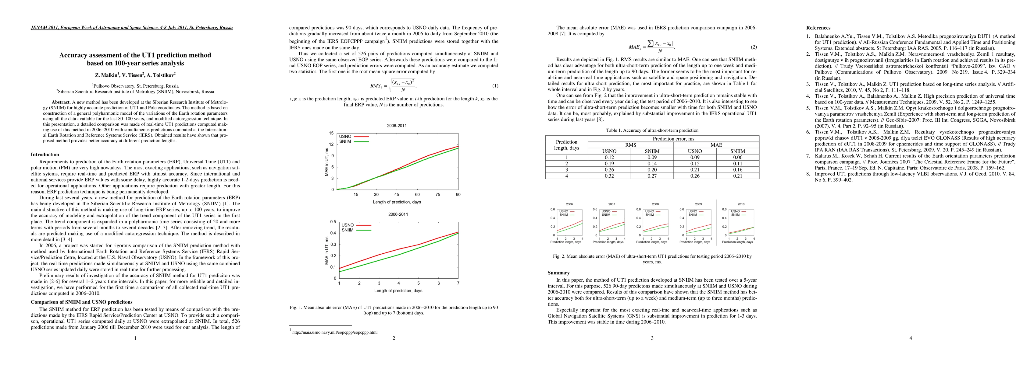 A new method has been developed at the Siberian Research Institute of Metrology (SNIIM) for highly accurate prediction of UT1 and Pole coordinates. The method is based on construction of a general polyharmonic model of the variations of the Earth rotation parameters using all the data available for the last 80-100 years, and modified autoregression technique. In this presentation, a detailed comparison was made of real-time UT1 predictions computed making use of this method in 2006-2010 with simultaneous predictions computed at the International Earth Rotation and Reference Systems Service (IERS). Obtained results have shown that proposed method provides better accuracy at different prediction lengths.