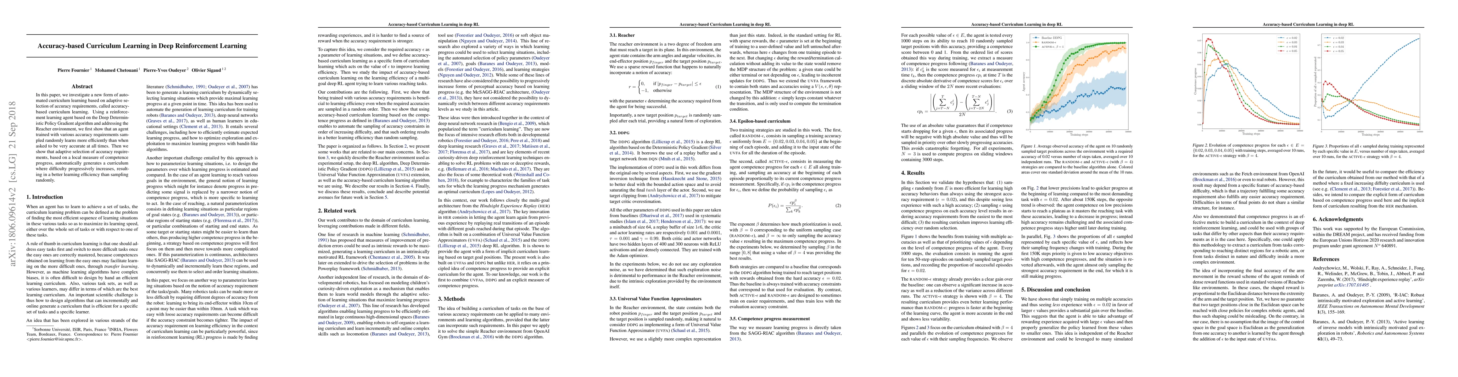 This paper proposes accuracy-based curriculum learning for deep reinforcement learning, demonstrating that an agent trained with adaptively selected accuracy requirements learns more efficiently than when consistently high accuracy is required. It shows that adaptively adjusting difficulty based on local competence progress enhances learning efficiency compared to random sampling.