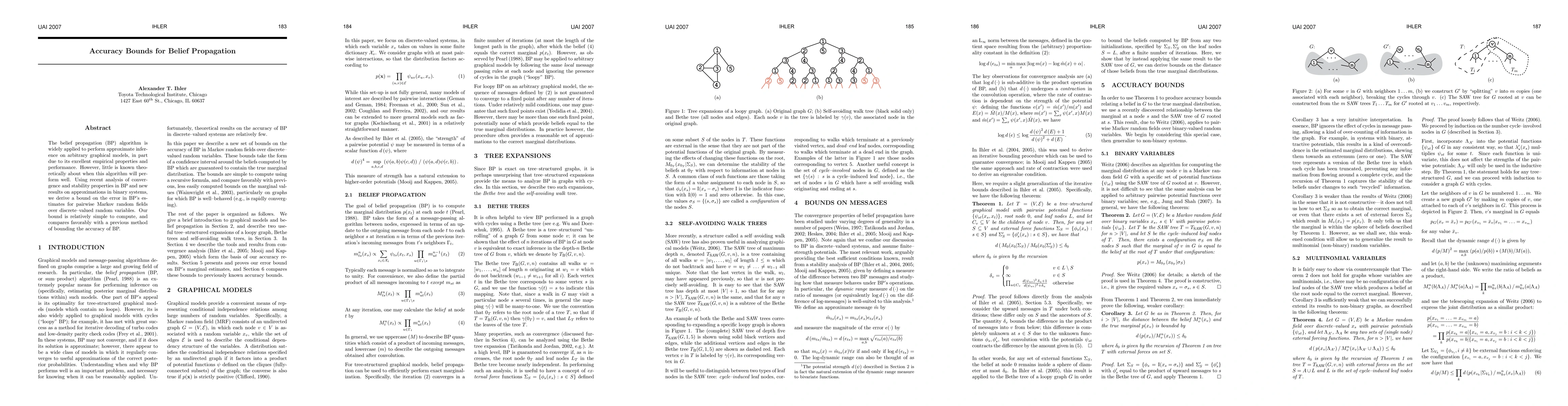 The belief propagation (BP) algorithm is widely applied to perform approximate inference on arbitrary graphical models, in part due to its excellent empirical properties and performance. However, little is known theoretically about when this algorithm will perform well. Using recent analysis of convergence and stability properties in BP and new results on approximations in binary systems, we derive a bound on the error in BP's estimates for pairwise Markov random fields over discrete valued random variables. Our bound is relatively simple to compute, and compares favorably with a previous method of bounding the accuracy of BP.