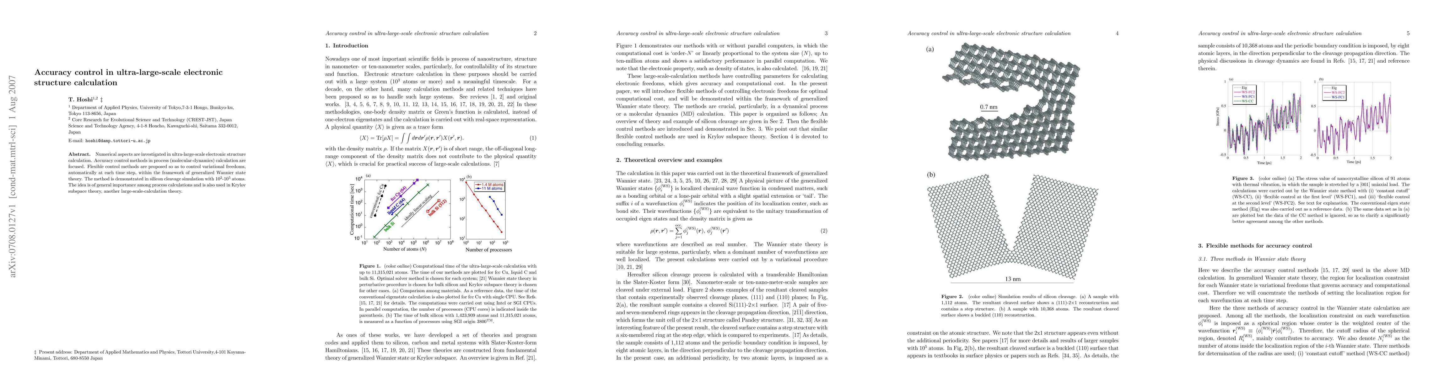 This paper proposes flexible, automated accuracy control methods for ultra-large-scale electronic structure calculations, demonstrated through silicon cleavage simulations with up to 10^5 atoms, utilizing generalized Wannier state theory and applicable to Krylov subspace methods.