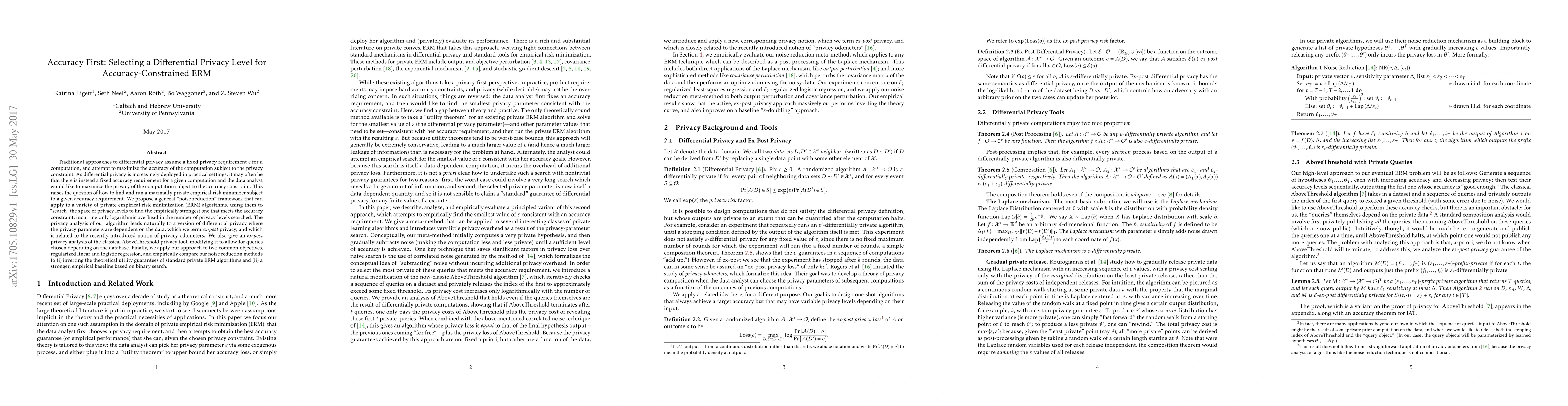 This paper proposes a "noise reduction" framework to select an optimal differential privacy level that maximizes privacy while meeting a fixed accuracy requirement for empirical risk minimization (ERM) algorithms. It introduces ex-post privacy, where privacy parameters adapt to data, and applies the method to regularized linear and logistic regression, comparing it to standard and empirical baselines.