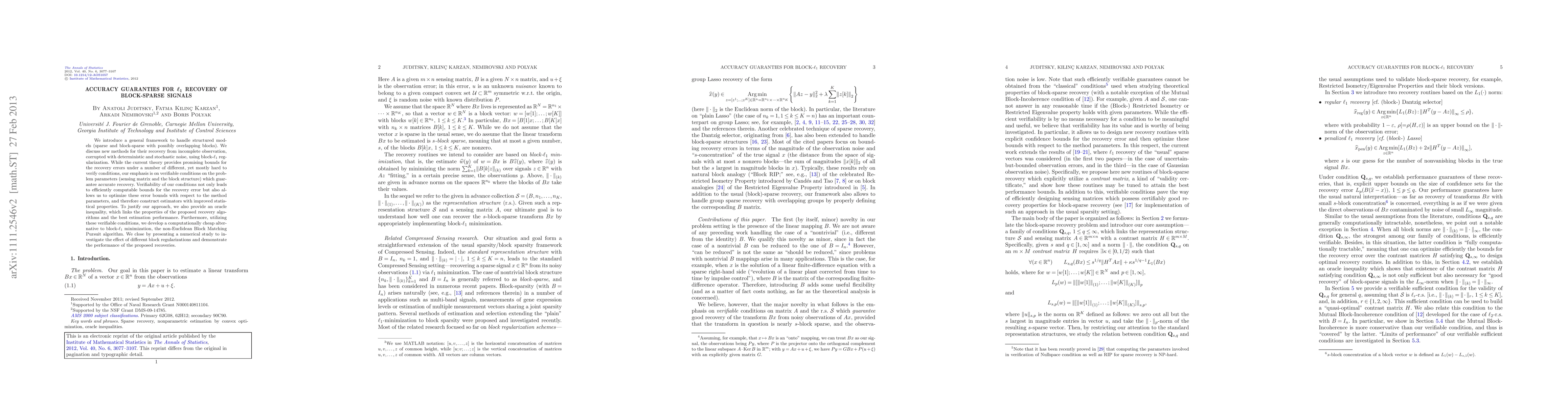 We introduce a general framework to handle structured models (sparse and block-sparse with possibly overlapping blocks). We discuss new methods for their recovery from incomplete observation, corrupted with deterministic and stochastic noise, using block-$\ell_1$ regularization. While the current theory provides promising bounds for the recovery errors under a number of different, yet mostly hard to verify conditions, our emphasis is on verifiable conditions on the problem parameters (sensing matrix and the block structure) which guarantee accurate recovery. Verifiability of our conditions not only leads to efficiently computable bounds for the recovery error but also allows us to optimize these error bounds with respect to the method parameters, and therefore construct estimators with improved statistical properties. To justify our approach, we also provide an oracle inequality, which links the properties of the proposed recovery algorithms and the best estimation performance. Furthermore, utilizing these verifiable conditions, we develop a computationally cheap alternative to block-$\ell_1$ minimization, the non-Euclidean Block Matching Pursuit algorithm. We close by presenting a numerical study to investigate the effect of different block regularizations and demonstrate the performance of the proposed recoveries.