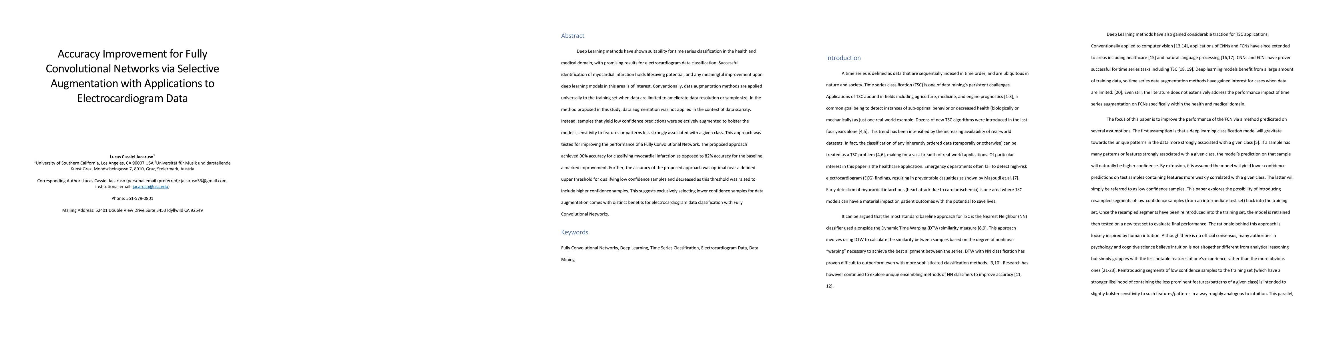 This paper proposes a selective data augmentation method for Fully Convolutional Networks to improve electrocardiogram classification accuracy, focusing on augmenting low confidence samples for better feature sensitivity. The method achieved 90% accuracy in detecting myocardial infarction, significantly outperforming the baseline model's 82% accuracy.
