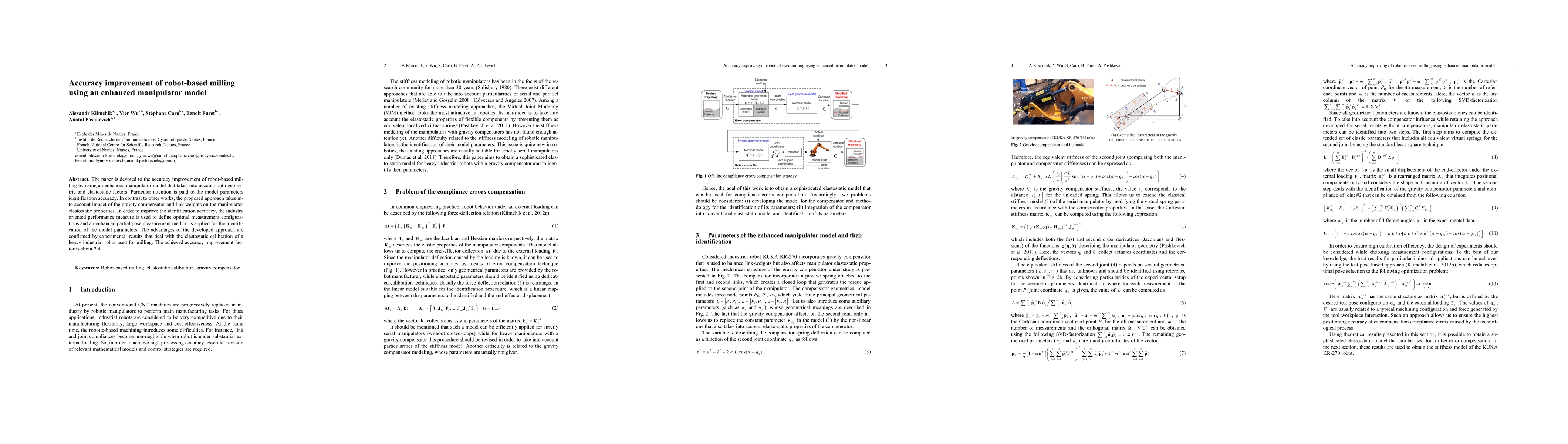 The paper is devoted to the accuracy improvement of robot-based milling by using an enhanced manipulator model that takes into account both geometric and elastostatic factors. Particular attention is paid to the model parameters identification accuracy. In contrast to other works, the proposed approach takes into account impact of the gravity compensator and link weights on the manipulator elastostatic properties. In order to improve the identification accuracy, the industry oriented performance measure is used to define optimal measurement configurations and an enhanced partial pose measurement method is applied for the identification of the model parameters. The advantages of the developed approach are confirmed by experimental results that deal with the elastostatic calibration of a heavy industrial robot used for milling. The achieved accuracy improvement factor is about 2.4.