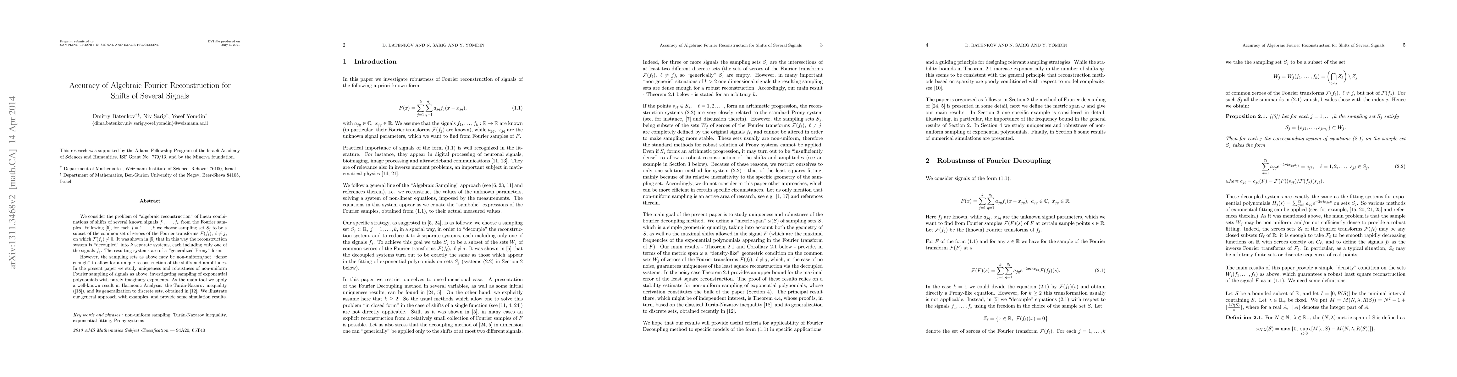 This paper investigates the accuracy of algebraic Fourier reconstruction for shifts of several signals, using non-uniform sampling sets and a modified Turan-Nazarov inequality to analyze uniqueness and robustness.