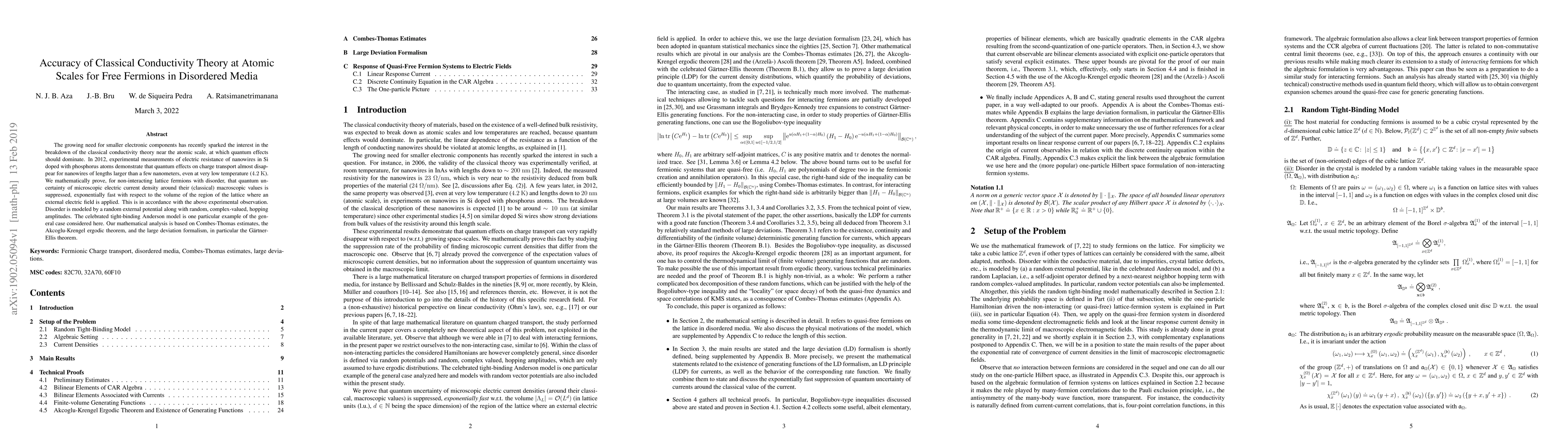 The growing need for smaller electronic components has recently sparked the interest in the breakdown of the classical conductivity theory near the atomic scale, at which quantum effects should dominate. In 2012, experimental measurements of electric resistance of nanowires in Si doped with phosphorus atoms demonstrate that quantum effects on charge transport almost disappear for nanowires of lengths larger than a few nanometers, even at very low temperature (4.2K). We mathematically prove, for non-interacting lattice fermions with disorder, that quantum uncertainty of microscopic electric current density around their (classical) macroscopic values is suppressed, exponentially fast with respect to the volume of the region of the lattice where an external electric field is applied. This is in accordance with the above experimental observation. Disorder is modeled by a random external potential along with random, complex-valued, hopping amplitudes. The celebrated tight-binding Anderson model is one particular example of the general case considered here. Our mathematical analysis is based on Combes-Thomas estimates, the Akcoglu-Krengel ergodic theorem, and the large deviation formalism, in particular the G\"artner-Ellis theorem.
