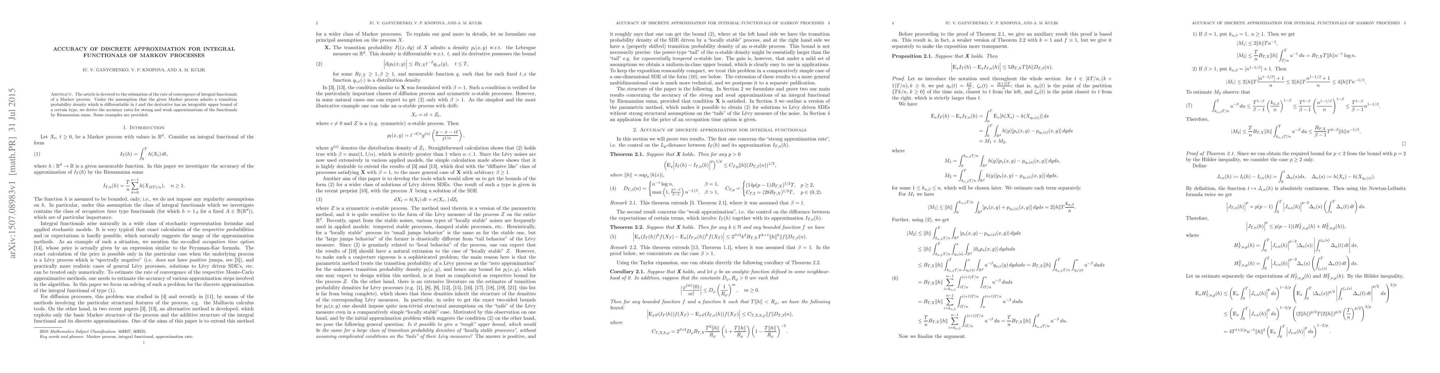 This paper estimates the convergence rate of integral functionals of Markov processes using discrete approximations. It derives accuracy rates for both strong and weak approximations under the condition that the transition probability density is differentiable with an integrable upper bound.
