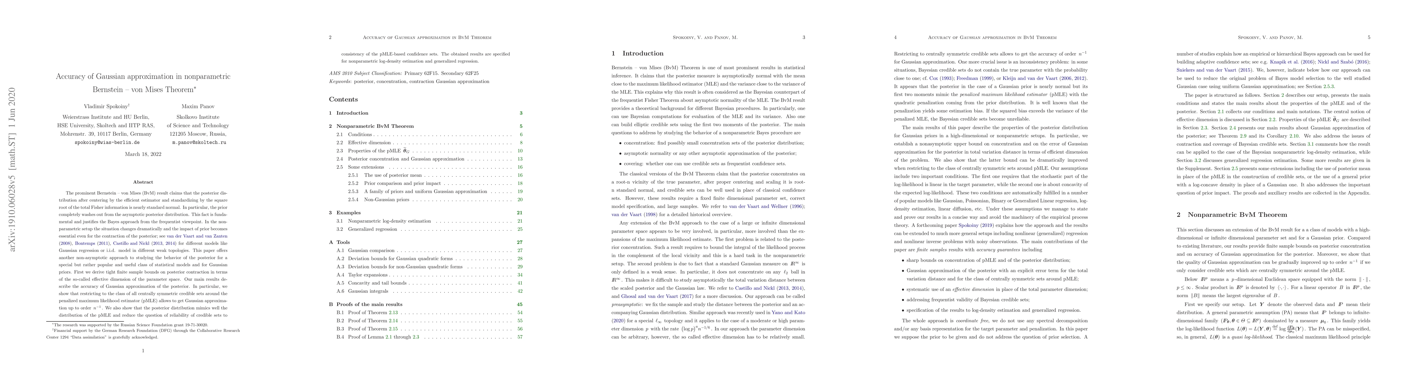This paper investigates the accuracy of Gaussian approximation in the nonparametric Bernstein-von Mises Theorem, focusing on posterior contraction and effective dimension. It demonstrates that Gaussian approximation up to order (n^{-1}) is achievable for centrally symmetric credible sets around the penalized maximum likelihood estimator (pMLE), highlighting the reliability of credible sets through pMLE consistency.