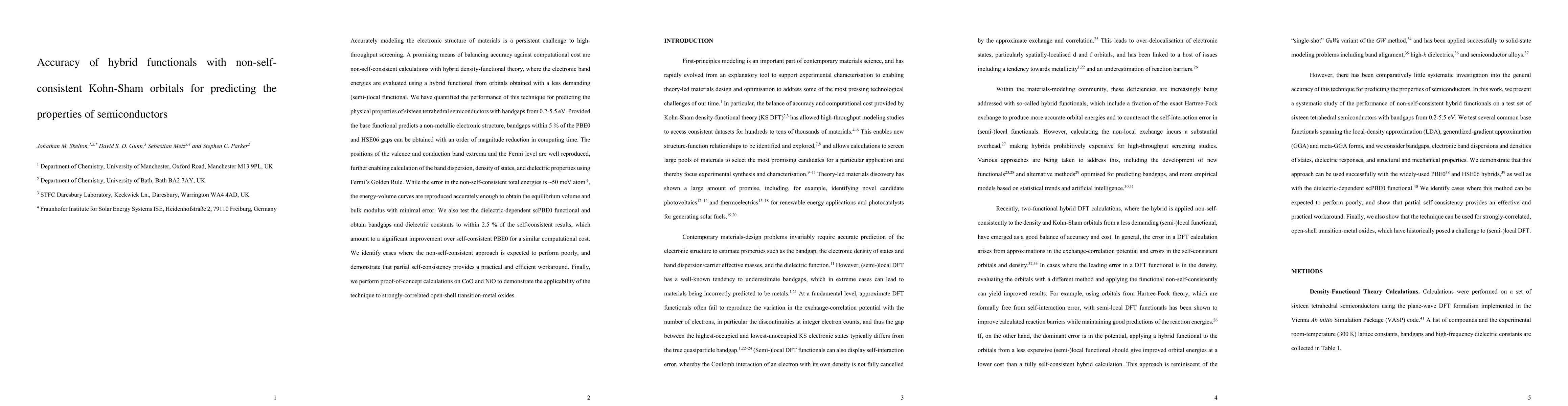 This paper evaluates the accuracy of hybrid functionals using non-self-consistent Kohn-Sham orbitals for predicting semiconductor properties, achieving bandgaps within 5% of established methods with significantly reduced computational cost. The technique also accurately reproduces band dispersion, density of states, and dielectric properties.