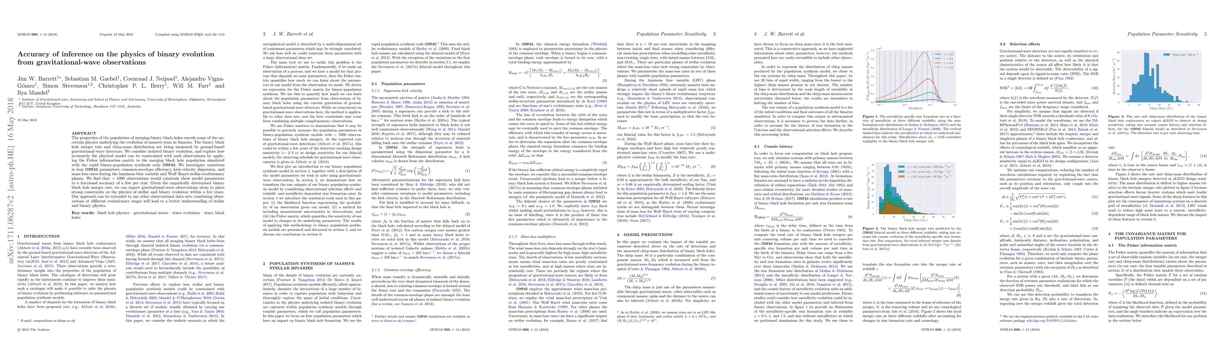 The properties of the population of merging binary black holes encode some of the uncertain physics of the evolution of massive stars in binaries. The binary black hole merger rate and chirp mass distribution are being measured by ground-based gravitational-wave detectors. We consider isolated binary evolution and explore how accurately the physical model can be constrained with such observations by applying the Fisher information matrix to the merging black hole population simulated with the rapid binary population synthesis code COMPAS. We investigate variations in four COMPAS parameters: common envelope efficiency, kick velocity dispersion, and mass loss rates during the luminous blue variable and Wolf--Rayet stellar evolutionary phases. We find that 1000 observations would constrain these model parameters to a fractional accuracy of a few percent. Given the empirically determined binary black hole merger rate, we can expect gravitational-wave observations alone to place strong constraints on the physics of stellar and binary evolution within a few years.