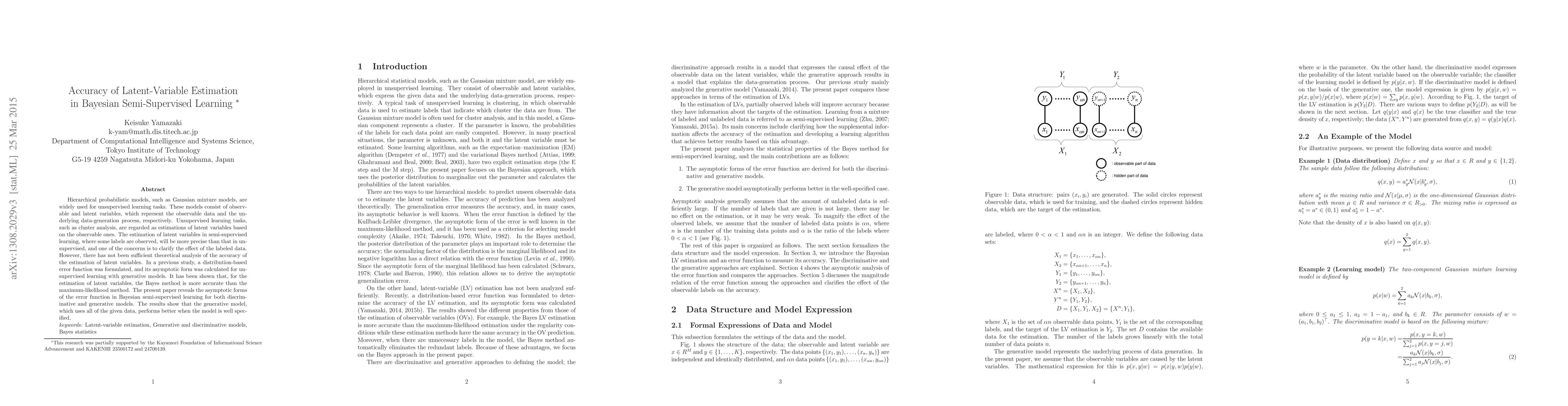 This paper investigates the accuracy of latent-variable estimation in Bayesian semi-supervised learning, revealing the asymptotic forms of error functions for both discriminative and generative models. It concludes that the generative model, utilizing all available data, performs better when the model is well specified.