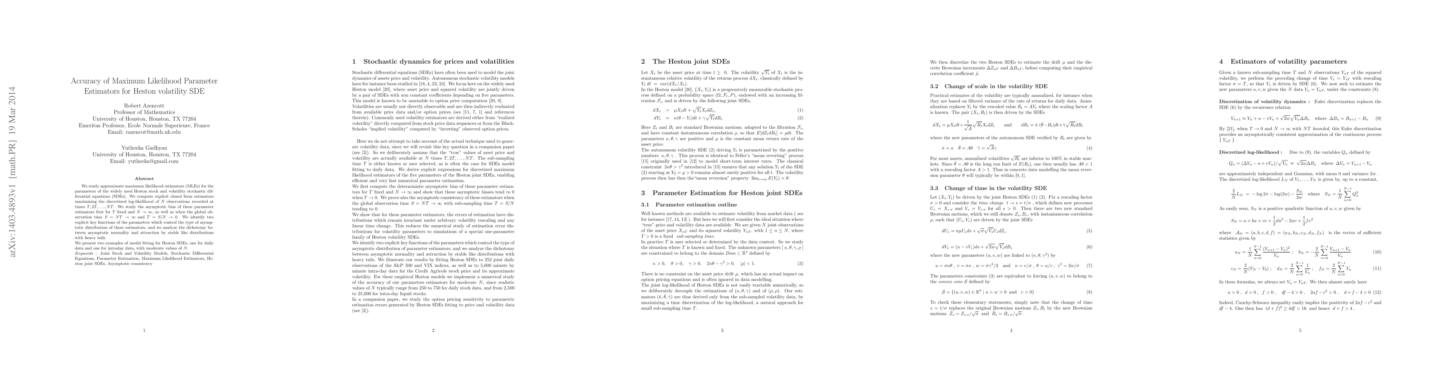 We study approximate maximum likelihood estimators (MLEs) for the parameters of the widely used Heston stock and volatility stochastic differential equations (SDEs). We compute explicit closed form estimators maximizing the discretized log-likelihood of $N$ observations recorded at times $T,2T, \ldots, NT$. We study the asymptotic bias of these parameter estimators first for $T$ fixed and $N \to \infty$, as well as when the global observation time $S= NT \to \infty$ and $T = S/N \to 0$. We identify two explicit key functions of the parameters which control the type of asymptotic distribution of these estimators, and we analyze the dichotomy between asymptotic normality and attraction by stable like distributions with heavy tails. \\ We present two examples of model fitting for Heston SDEs, one for daily data and one for intraday data, with moderate values of $N$.