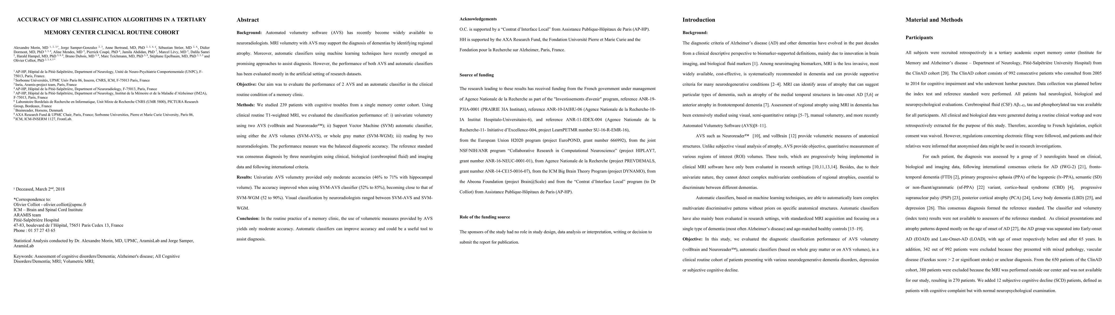 BACKGROUND:Automated volumetry software (AVS) has recently become widely available to neuroradiologists. MRI volumetry with AVS may support the diagnosis of dementias by identifying regional atrophy. Moreover, automatic classifiers using machine learning techniques have recently emerged as promising approaches to assist diagnosis. However, the performance of both AVS and automatic classifiers has been evaluated mostly in the artificial setting of research datasets.OBJECTIVE:Our aim was to evaluate the performance of two AVS and an automatic classifier in the clinical routine condition of a memory clinic.METHODS:We studied 239 patients with cognitive troubles from a single memory center cohort. Using clinical routine T1-weighted MRI, we evaluated the classification performance of: 1) univariate volumetry using two AVS (volBrain and Neuroreader$^{TM}$); 2) Support Vector Machine (SVM) automatic classifier, using either the AVS volumes (SVM-AVS), or whole gray matter (SVM-WGM); 3) reading by two neuroradiologists. The performance measure was the balanced diagnostic accuracy. The reference standard was consensus diagnosis by three neurologists using clinical, biological (cerebrospinal fluid) and imaging data and following international criteria.RESULTS:Univariate AVS volumetry provided only moderate accuracies (46% to 71% with hippocampal volume). The accuracy improved when using SVM-AVS classifier (52% to 85%), becoming close to that of SVM-WGM (52 to 90%). Visual classification by neuroradiologists ranged between SVM-AVS and SVM-WGM.CONCLUSION:In the routine practice of a memory clinic, the use of volumetric measures provided by AVS yields only moderate accuracy. Automatic classifiers can improve accuracy and could be a useful tool to assist diagnosis.