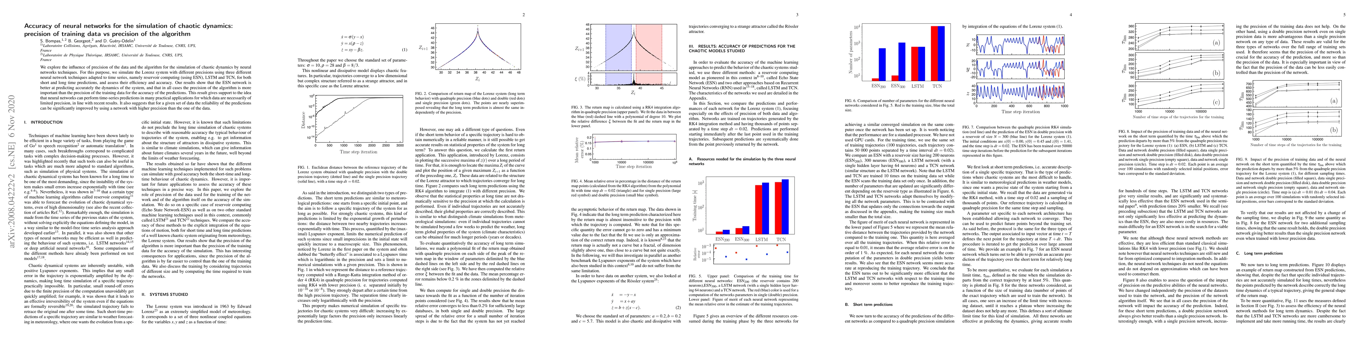 This paper investigates how the precision of training data and the neural network algorithm affect the accuracy of chaotic dynamics simulation, using the Lorenz system and three neural network techniques: ESN, LSTM, and TCN. The study finds that the ESN network is most effective, and that algorithm precision is more crucial than data precision for accurate predictions.