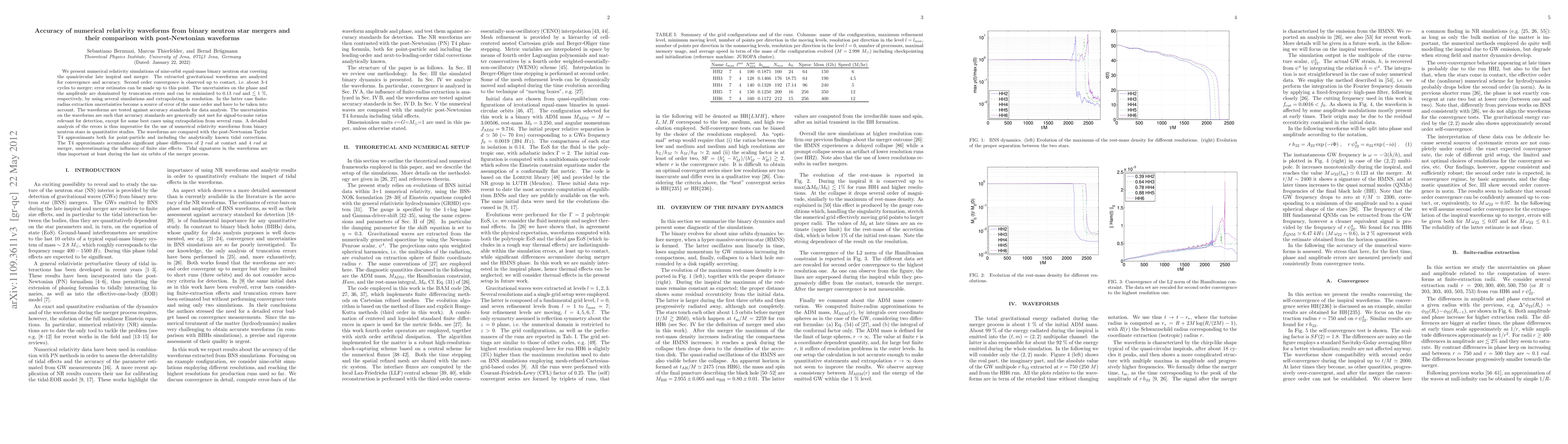 This paper presents numerical relativity simulations of binary neutron star mergers, analyzing the convergence and accuracy of gravitational waveforms up to the merger. The study finds that while the waveforms can achieve high accuracy, they do not meet detection standards for most signal-to-noise ratios, except in best-case scenarios. The waveforms are also compared with post-Newtonian approximants, revealing significant phase differences and underscoring the importance of tidal effects in the final stages of the merger.