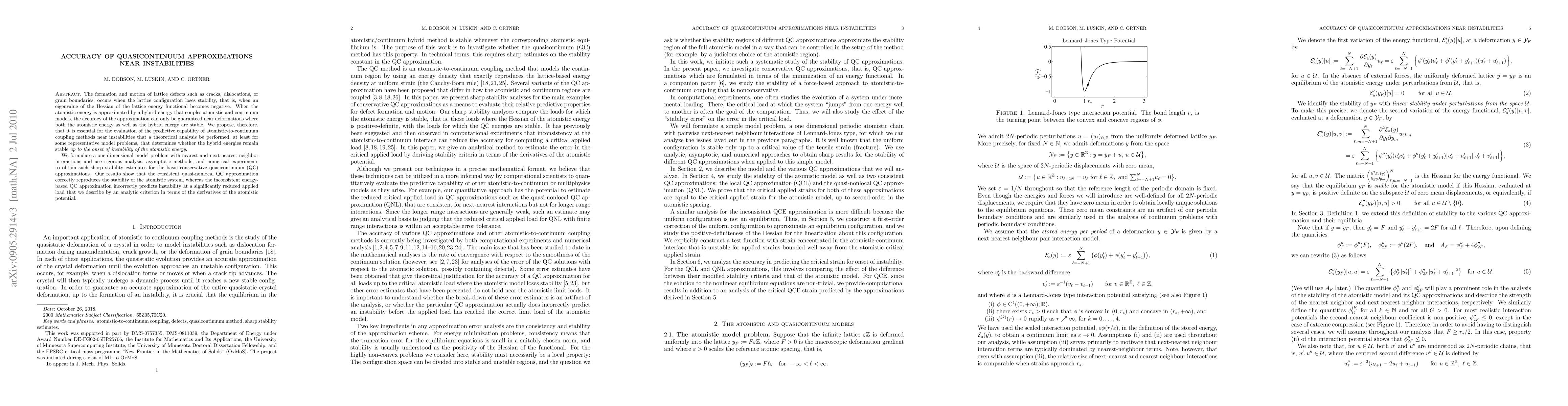 The formation and motion of lattice defects such as cracks, dislocations, or grain boundaries, occurs when the lattice configuration loses stability, that is, when an eigenvalue of the Hessian of the lattice energy functional becomes negative. When the atomistic energy is approximated by a hybrid energy that couples atomistic and continuum models, the accuracy of the approximation can only be guaranteed near deformations where both the atomistic energy as well as the hybrid energy are stable. We propose, therefore, that it is essential for the evaluation of the predictive capability of atomistic-to-continuum coupling methods near instabilities that a theoretical analysis be performed, at least for some representative model problems, that determines whether the hybrid energies remain stable {\em up to the onset of instability of the atomistic energy}. We formulate a one-dimensional model problem with nearest and next-nearest neighbor interactions and use rigorous analysis, asymptotic methods, and numerical experiments to obtain such sharp stability estimates for the basic conservative quasicontinuum (QC) approximations. Our results show that the consistent quasi-nonlocal QC approximation correctly reproduces the stability of the atomistic system, whereas the inconsistent energy-based QC approximation incorrectly predicts instability at a significantly reduced applied load that we describe by an analytic criterion in terms of the derivatives of the atomistic potential.