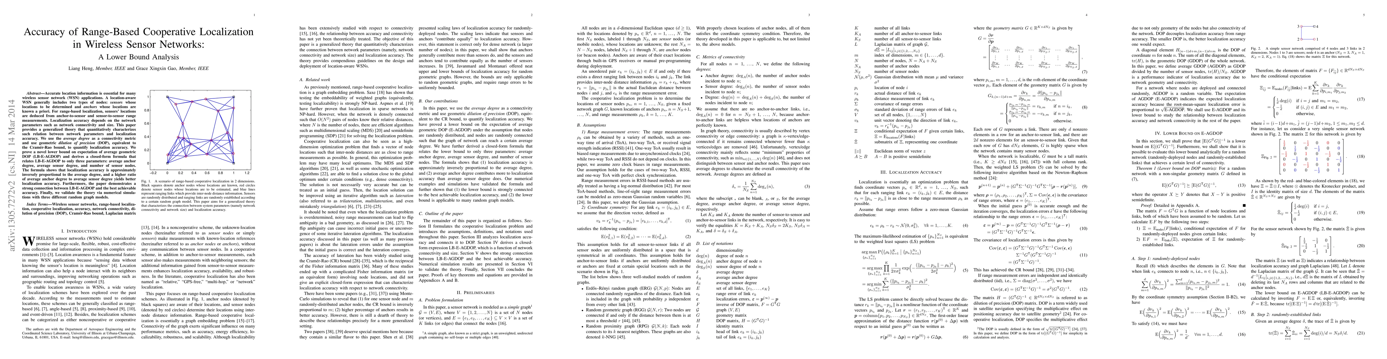 This paper establishes a lower bound on the expectation of average geometric dilution of precision (LB-E-AGDOP) for range-based cooperative localization in wireless sensor networks, showing that accuracy is inversely proportional to average degree and improves with a higher ratio of anchor to sensor degrees. The findings are validated through numerical simulations.
