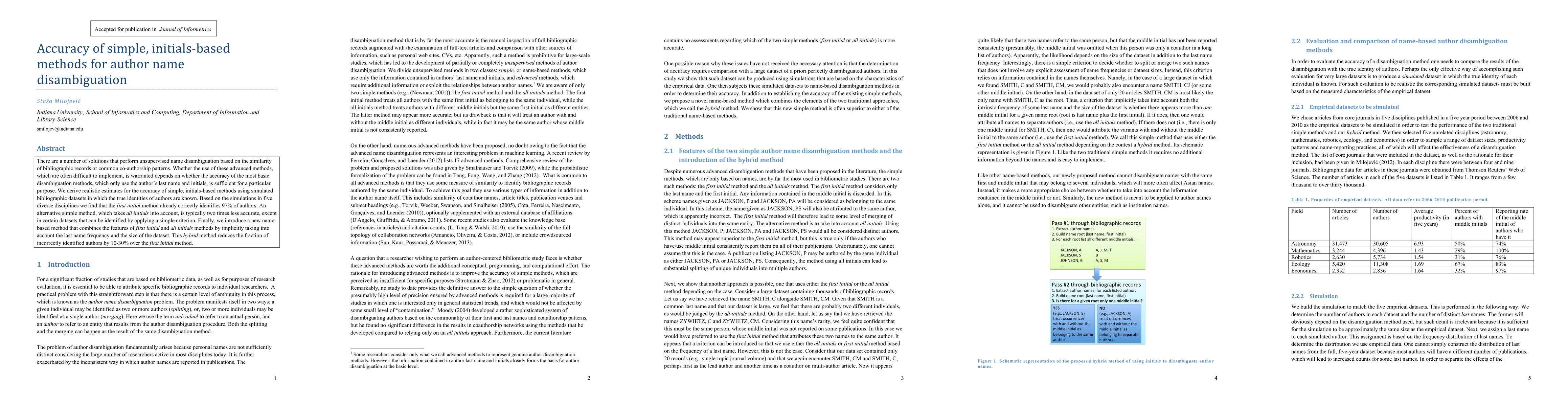 This paper evaluates the accuracy of simple, initials-based methods for author name disambiguation, finding that the first initial method correctly identifies 97% of authors. A hybrid method combining first initial and all initials approaches further reduces misidentification by 10-30%, depending on the dataset.
