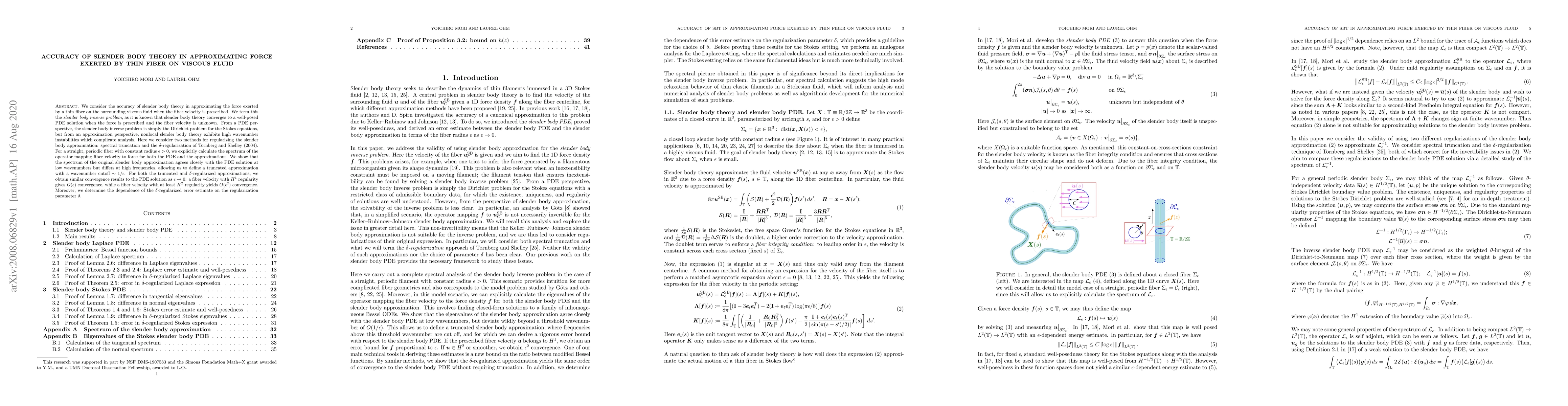 The research employs a combination of analytical and numerical methods to analyze the accuracy of slender body theory in approximating the force exerted by thin fibers on viscous fluids. It considers two regularization methods: spectral truncation and the $\delta$-regularization of Tornberg and Shelley (2004).