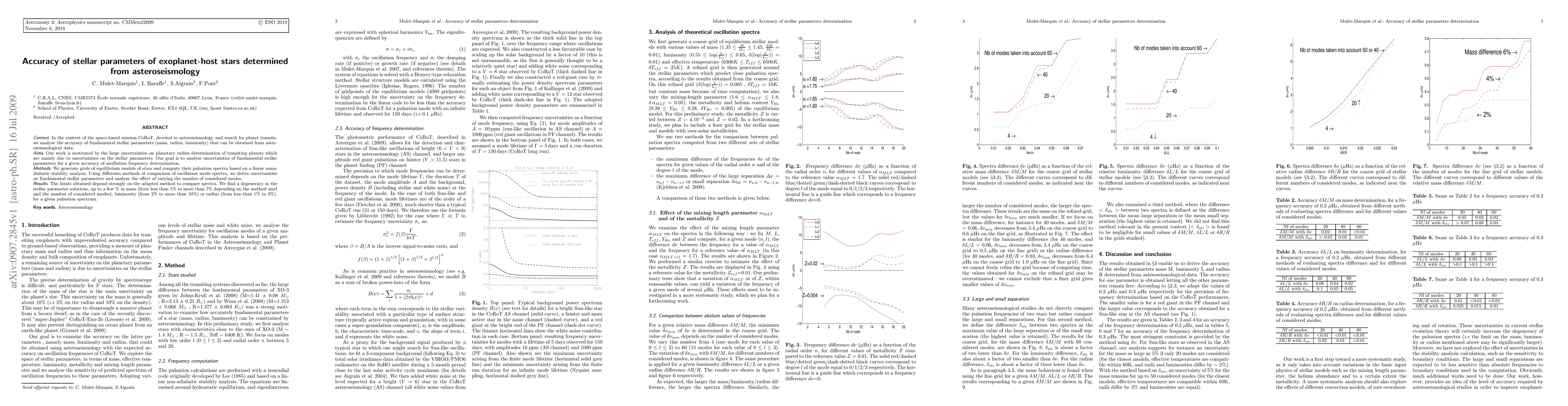 In the context of the space-based mission CoRoT, devoted to asteroseismology and search for planet transits, we analyse the accuracy of fundamental stellar parameters (mass, radius, luminosity) that can be obtained from asteroseismological data.} Our work is motivated by the large uncertainties on planetary radius determination of transiting planets which are mainly due to uncertainties on the stellar parameters. Our goal is to analyse uncertainties of fundamental stellar parameters for a given accuracy of oscillation frequency determination. We generate grids of equilibrium models of stars and compute their pulsation spectra based on a linear nonadiabatic stability analysis. Using differents methods of comparison of oscillation mode spectra, we derive uncertainties on fundamental stellar parameters and analyse the effect of varying the number of considered modes.} The limits obtained depend strongly on the adapted method to compare spectra. We find a degeneracy in the stellar parameter solutions, up to a few % in mass (from less than 1% to more than 7% depending on the method used and the number of considered modes), luminosity (from 2% to more than 10%) or radius (from less than 1% to 3%), for a given pulsation spectrum.