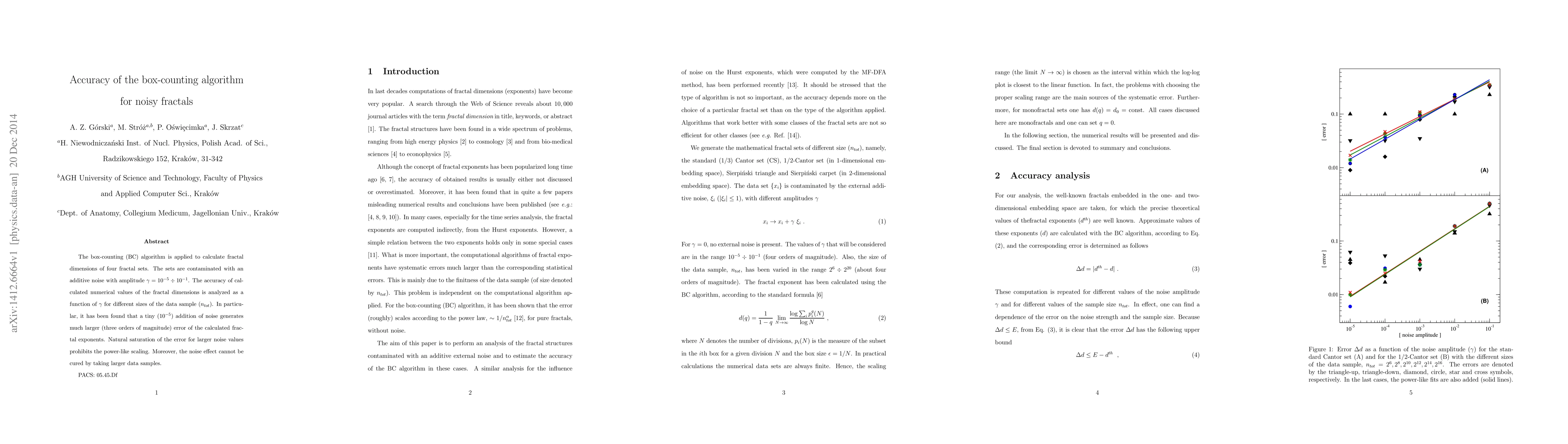 The box-counting algorithm's accuracy for determining fractal dimensions in noisy fractal sets is examined, revealing that even minimal noise ($\gamma = 10^{-5}$) significantly increases error by three orders of magnitude, with no improvement from larger data samples. Larger noise levels cause error saturation, preventing power-like scaling.