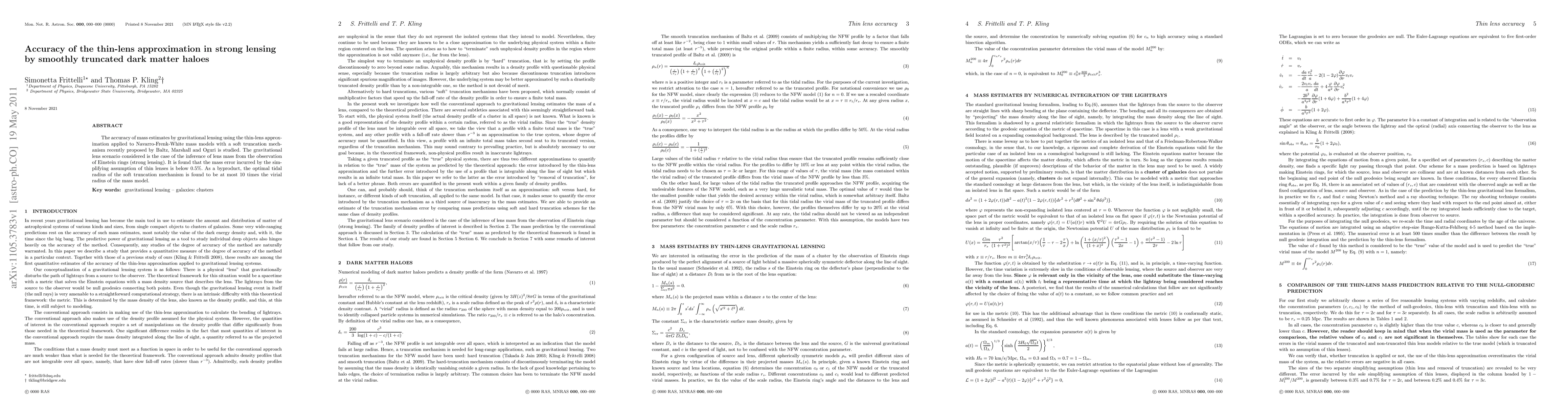 The accuracy of mass estimates by gravitational lensing using the thin-lens approximation applied to Navarro-Frenk-White mass models with a soft truncation mechanism recently proposed by Baltz, Marshall and Oguri is studied. The gravitational lens scenario considered is the case of the inference of lens mass from the observation of Einstein rings (strong lensing). It is found that the mass error incurred by the simplifying assumption of thin lenses is below 0.5%. As a byproduct, the optimal tidal radius of the soft truncation mechanism is found to be at most 10 times the virial radius of the mass model.