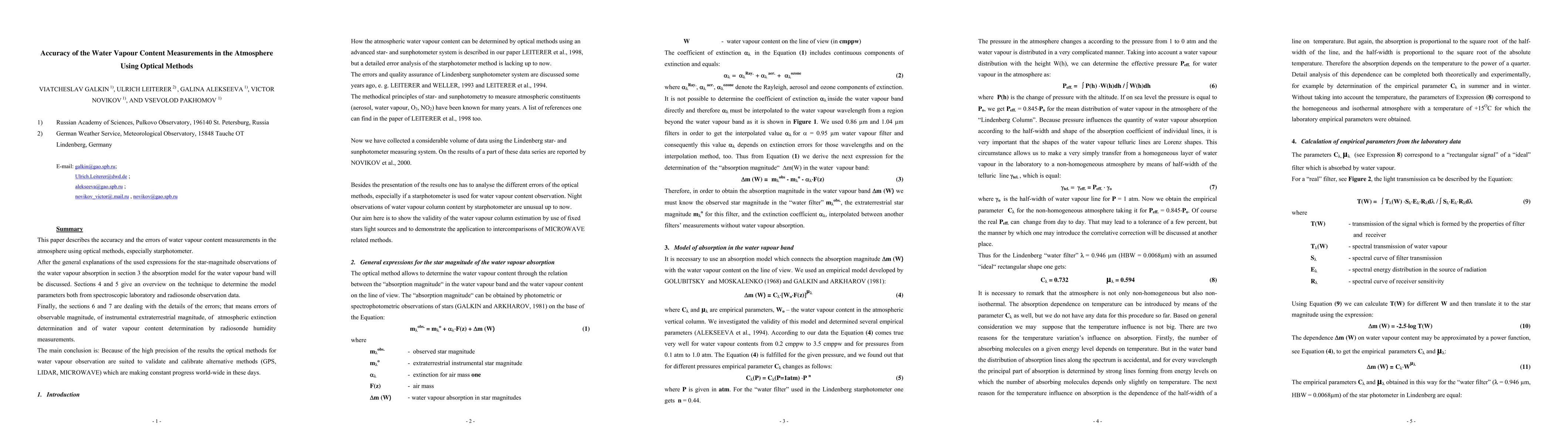 This paper evaluates the accuracy of optical methods, particularly starphotometers, for measuring atmospheric water vapour content, detailing error sources and validation techniques. It concludes that optical methods provide high precision, making them suitable for calibrating and validating other advanced measurement techniques like GPS, LIDAR, and MICROWAVE.