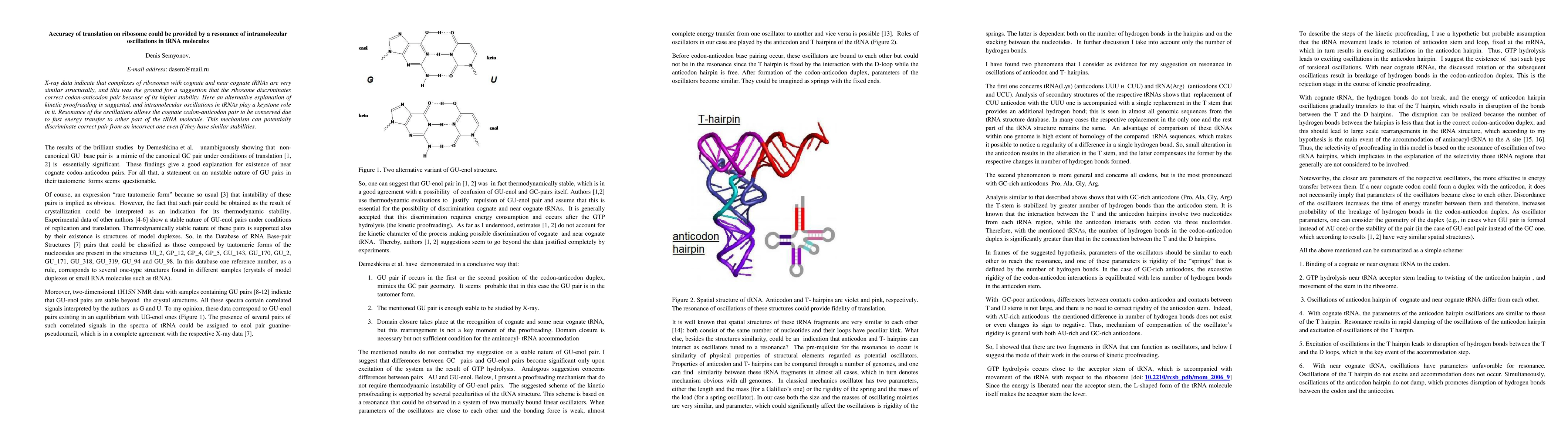 X-ray data indicate that complexes of ribosomes with cognate and near cognate tRNAs are very similar structurally, and this was the ground for a suggestion that the ribosome discriminates correct codon-anticodon pair because of its higher stability. Here an alternative explanation of kinetic proofreading is suggested, and intramolecular oscillations in tRNAs play a keystone role in it. Resonance of the oscillations allows the cognate codon-anticodon pair to be conserved due to fast energy transfer to other part of the tRNA molecule. This mechanism can potentially discriminate correct pair from an incorrect one even if they have similar stabilities.