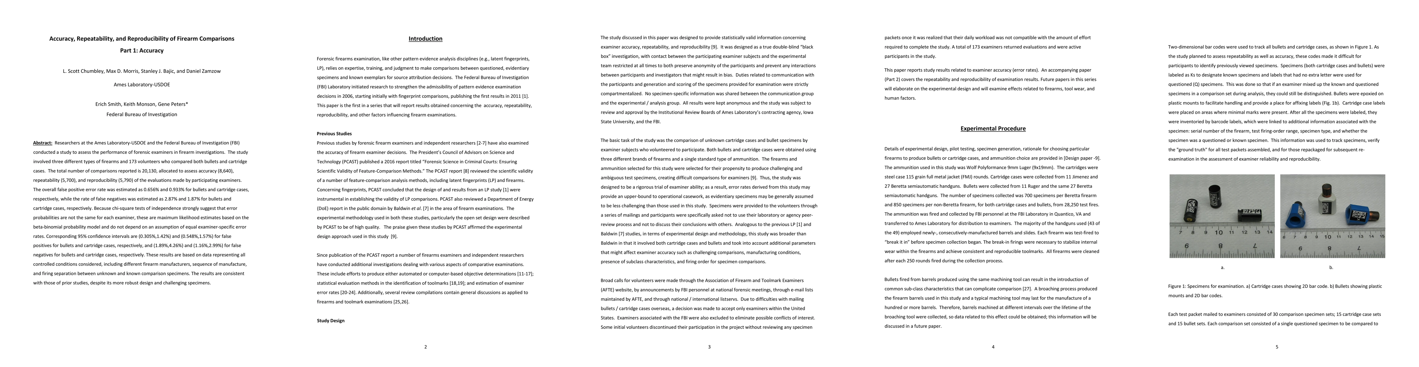 This study by researchers at the Ames Laboratory and FBI evaluated the accuracy of firearm examiners in comparing bullets and cartridge cases, finding an overall false positive error rate of 0.656% for bullets and 0.933% for cartridge cases, and false negative rates of 2.87% and 1.87%, respectively. The results indicate significant variability in examiner performance.