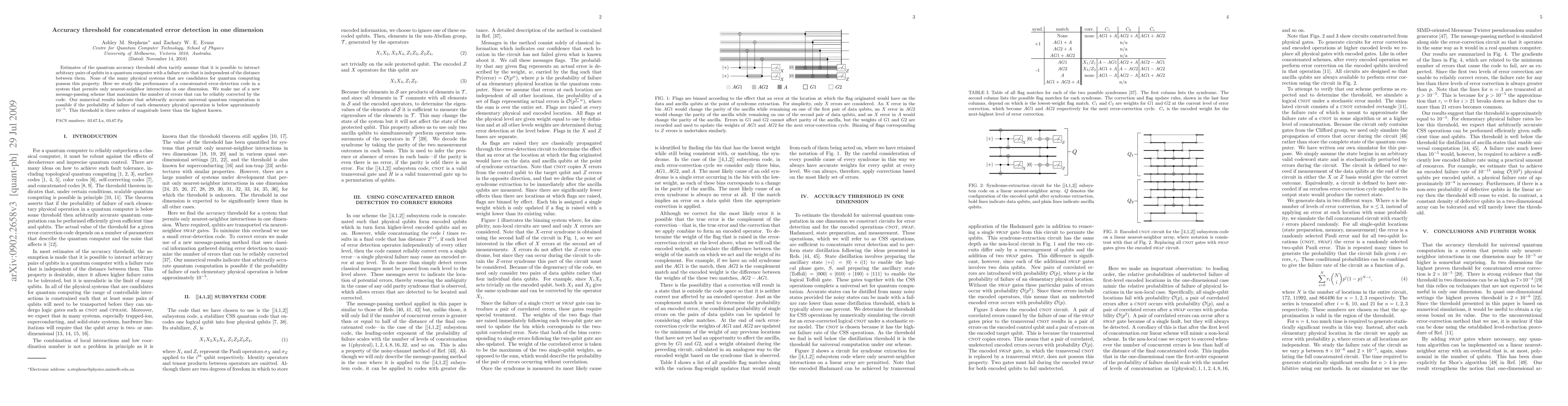 Estimates of the quantum accuracy threshold often tacitly assume that it is possible to interact arbitrary pairs of qubits in a quantum computer with a failure rate that is independent of the distance between them. None of the many physical systems that are candidates for quantum computing possess this property. Here we study the performance of a concatenated error-detection code in a system that permits only nearest-neighbor interactions in one dimension. We make use of a new message-passing scheme that maximizes the number of errors that can be reliably corrected by the code. Our numerical results indicate that arbitrarily accurate universal quantum computation is possible if the probability of failure of each elementary physical operation is below approximately 10^{-5}. This threshold is three orders of magnitude lower than the highest known.