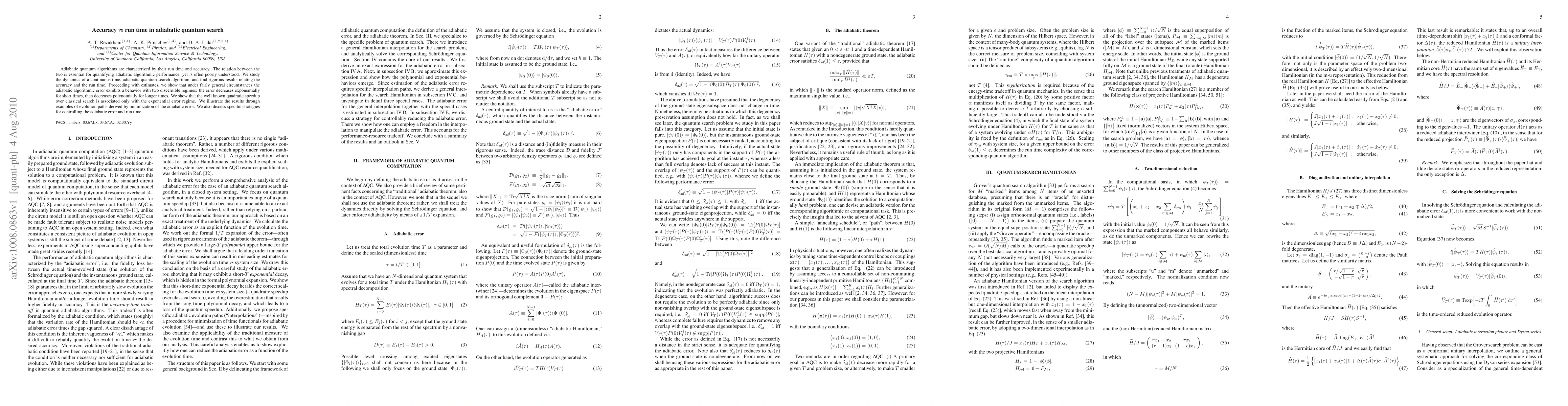 This paper explores the relationship between accuracy and run time in adiabatic quantum search algorithms, revealing two distinct regimes for error behavior: exponential decay for short times and polynomial decay for longer times. The study shows that the quadratic speedup over classical search is confined to the exponential decay regime.