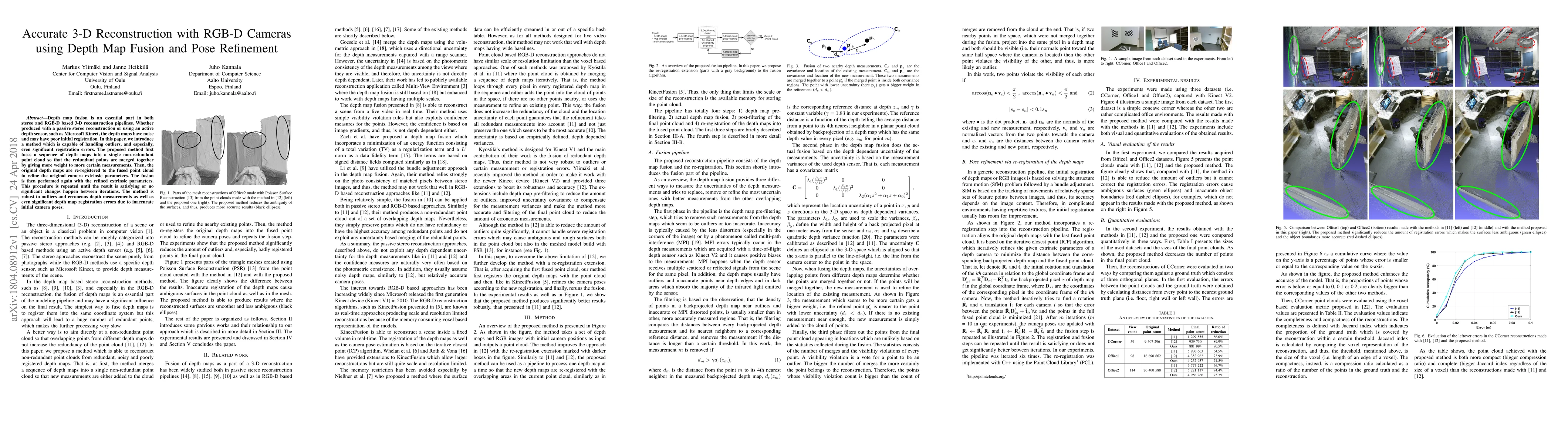 This paper proposes a method for accurate 3-D reconstruction using RGB-D cameras that fuses depth maps to create a non-redundant point cloud, refines camera extrinsic parameters through re-registration, and iteratively improves the reconstruction to handle outliers and registration errors. The approach ensures robust reconstruction despite initial inaccuracies.