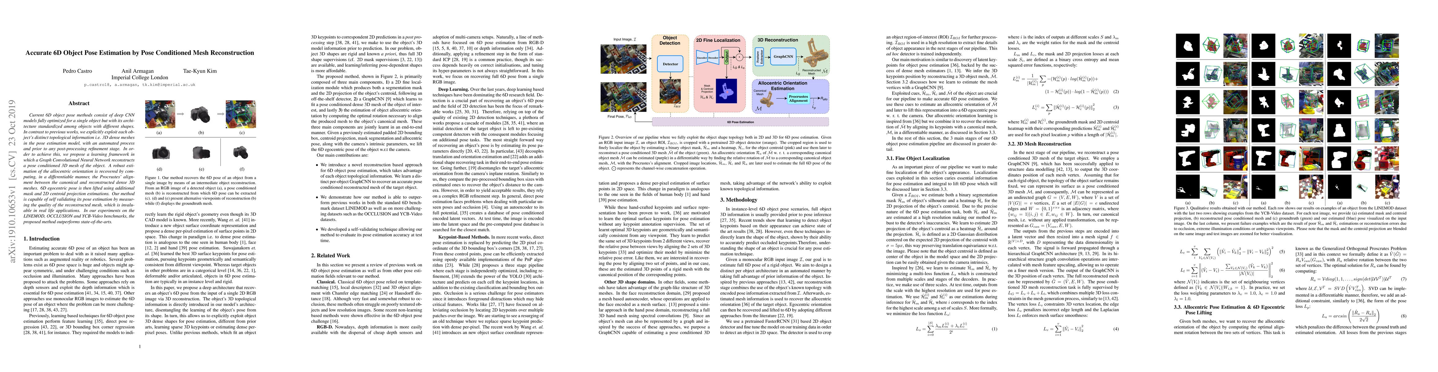 This paper proposes a novel method for 6D object pose estimation using pose-conditioned 3D mesh reconstruction with Graph Convolutional Neural Networks, achieving superior performance on benchmark datasets compared to existing methods. The approach leverages the distinct topological information of each object and validates pose estimation through mesh reconstruction quality.