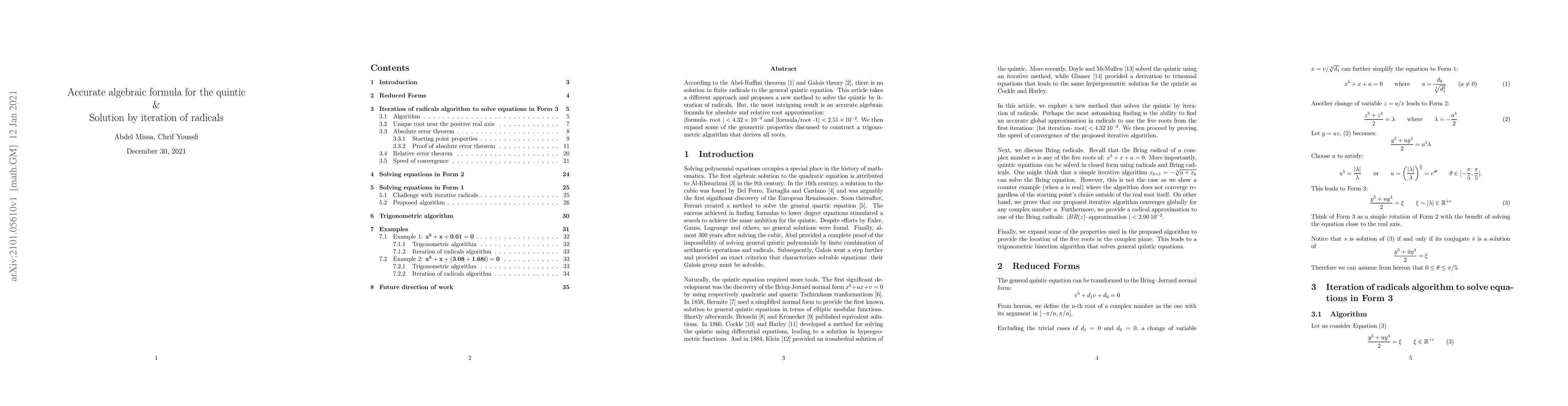 According to the Abel-Ruffini theorem [1] and Galois theory [2], there is no solution in finite radicals to the general quintic equation. This article takes a different approach and proposes a new method to solve the quintic by iteration of radicals. But, the most intriguing result is an accurate algebraic formula for absolute and relative root approximation: |formula - root| < 0.00432 and |formula/root - 1| < 0.0251. We then expand some of the geometric properties discussed to construct a trigonometric algorithm that derives all roots.