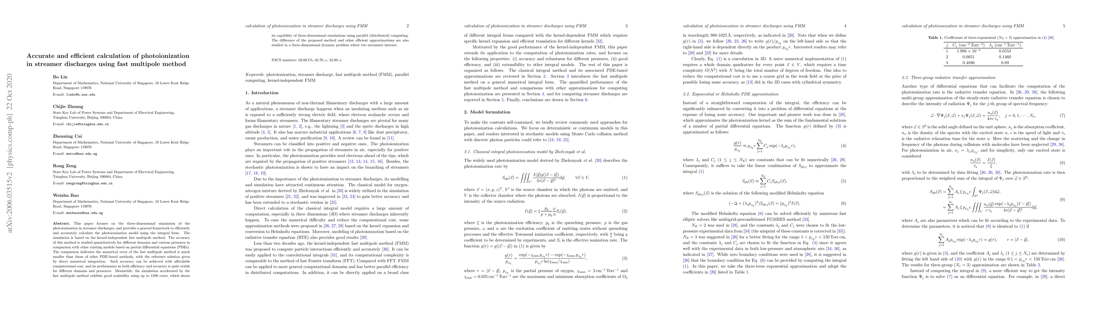 This paper presents a fast multipole method for accurately and efficiently simulating photoionization in streamer discharges, demonstrating superior accuracy and lower computational cost compared to PDE-based methods, while maintaining stability and scalability across various domains and pressures.