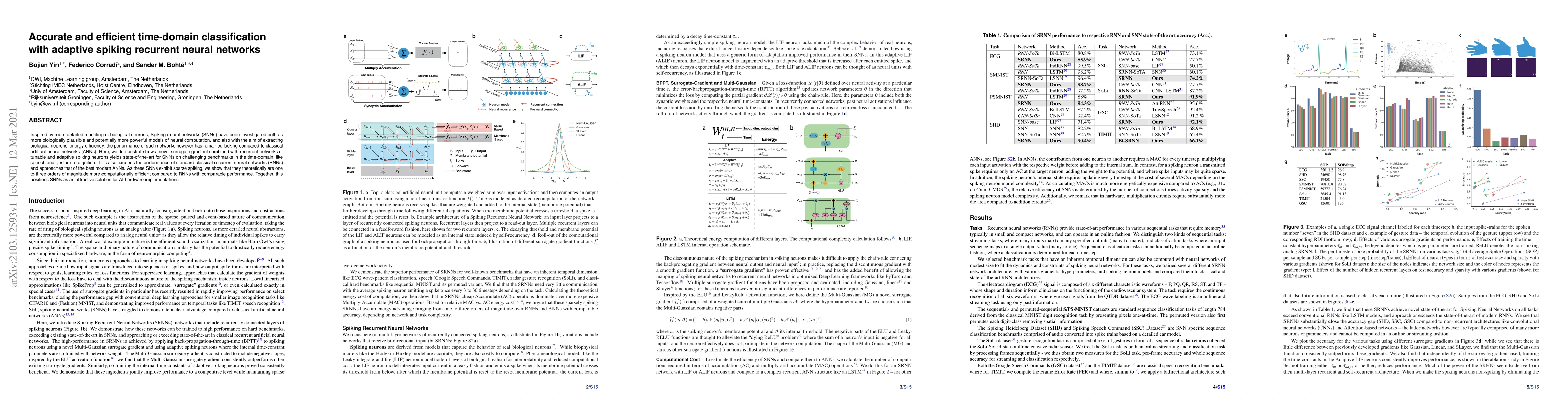 This paper introduces adaptive spiking recurrent neural networks with a novel surrogate gradient, achieving state-of-the-art performance in time-domain classification tasks such as speech and gesture recognition, surpassing standard RNNs and approaching the efficiency of modern ANNs. The proposed SNNs are significantly more computationally efficient due to their sparse spiking activity.