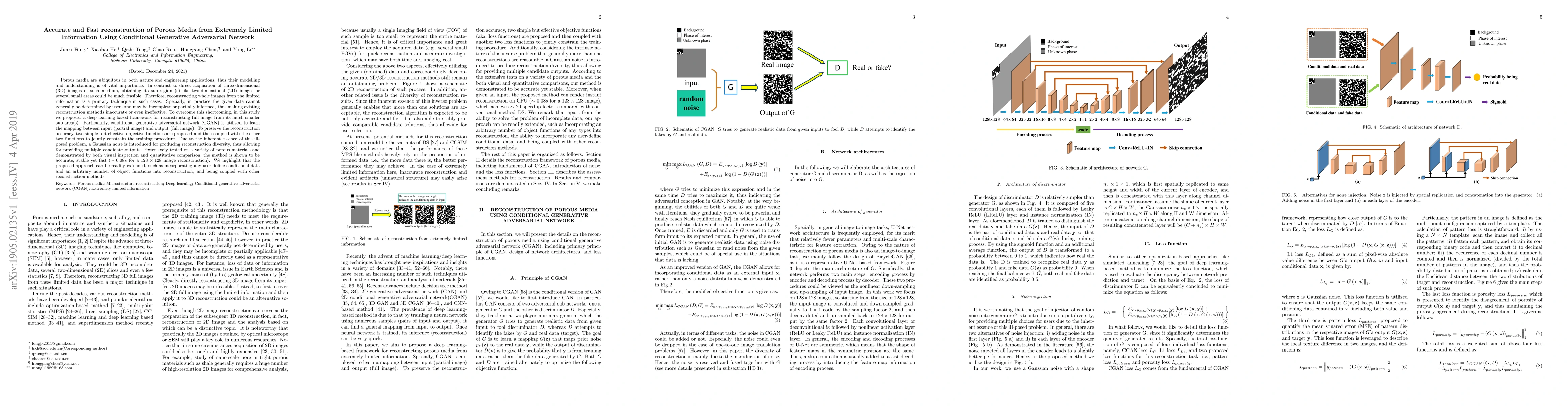 This paper proposes a deep learning framework using conditional generative adversarial networks (CGAN) to accurately and quickly reconstruct full 3D images of porous media from limited 2D sub-region data. The method introduces Gaussian noise to provide diverse reconstructions and is shown to be both accurate and fast, with a reconstruction time of approximately 0.08 seconds for a 128x128 image.