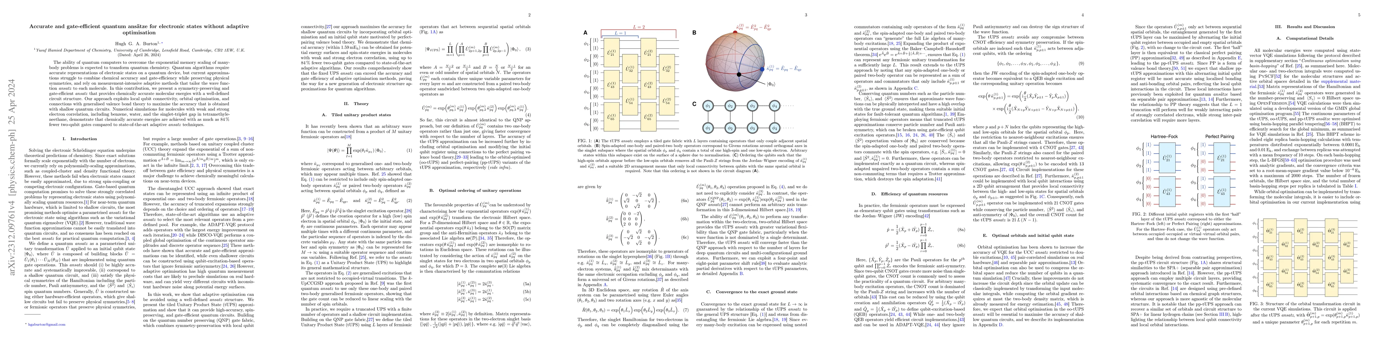 This paper introduces a new quantum ansatz that efficiently represents electronic states without requiring adaptive optimisation, achieving chemical accuracy while significantly reducing the number of two-qubit gates compared to adaptive methods. The approach leverages symmetry preservation, qubit connectivity, and orbital optimisation to provide accurate molecular energies for various molecules.