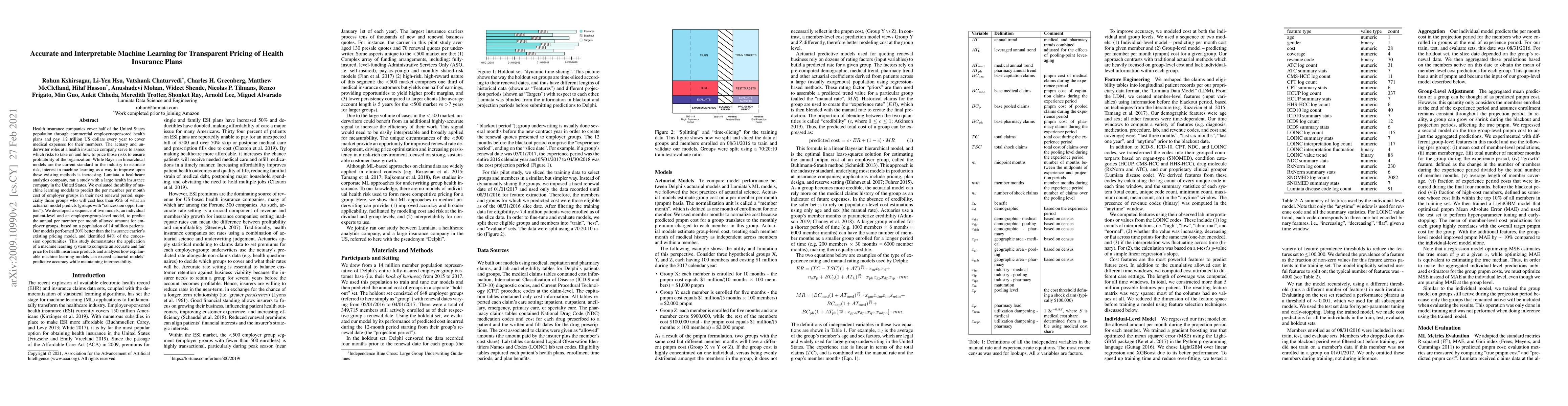 Health insurance companies cover half of the United States population through commercial employer-sponsored health plans and pay 1.2 trillion US dollars every year to cover medical expenses for their members. The actuary and underwriter roles at a health insurance company serve to assess which risks to take on and how to price those risks to ensure profitability of the organization. While Bayesian hierarchical models are the current standard in the industry to estimate risk, interest in machine learning as a way to improve upon these existing methods is increasing. Lumiata, a healthcare analytics company, ran a study with a large health insurance company in the United States. We evaluated the ability of machine learning models to predict the per member per month cost of employer groups in their next renewal period, especially those groups who will cost less than 95\% of what an actuarial model predicts (groups with "concession opportunities"). We developed a sequence of two models, an individual patient-level and an employer-group-level model, to predict the annual per member per month allowed amount for employer groups, based on a population of 14 million patients. Our models performed 20\% better than the insurance carrier's existing pricing model, and identified 84\% of the concession opportunities. This study demonstrates the application of a machine learning system to compute an accurate and fair price for health insurance products and analyzes how explainable machine learning models can exceed actuarial models' predictive accuracy while maintaining interpretability.