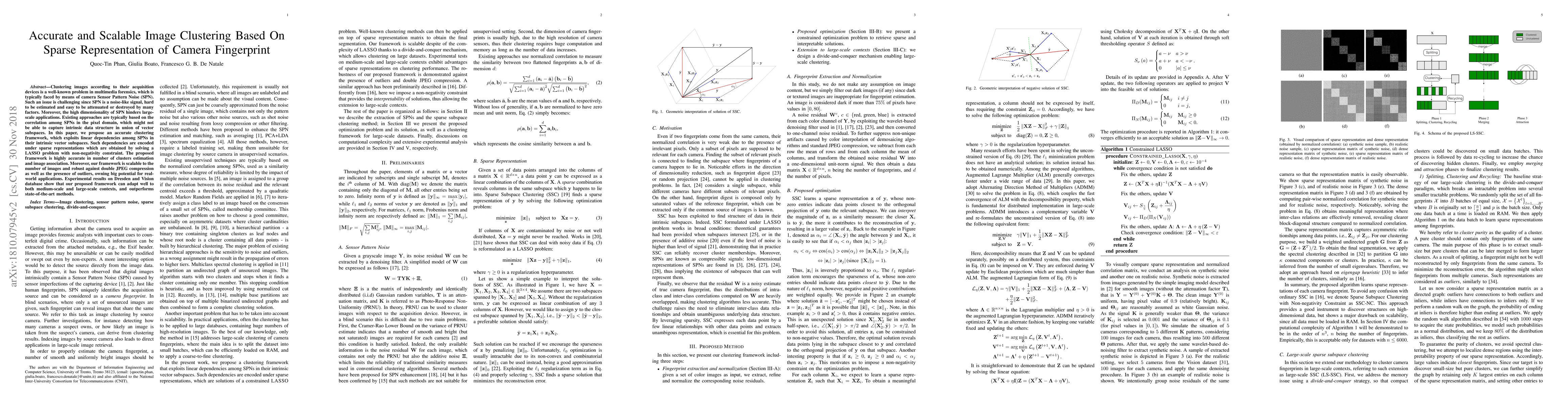 Clustering images according to their acquisition devices is a well-known problem in multimedia forensics, which is typically faced by means of camera Sensor Pattern Noise (SPN). Such an issue is challenging since SPN is a noise-like signal, hard to be estimated and easy to be attenuated or destroyed by many factors. Moreover, the high dimensionality of SPN hinders large-scale applications. Existing approaches are typically based on the correlation among SPNs in the pixel domain, which might not be able to capture intrinsic data structure in union of vector subspaces. In this paper, we propose an accurate clustering framework, which exploits linear dependencies among SPNs in their intrinsic vector subspaces. Such dependencies are encoded under sparse representations which are obtained by solving a LASSO problem with non-negativity constraint. The proposed framework is highly accurate in number of clusters estimation and image association. Moreover, our framework is scalable to the number of images and robust against double JPEG compression as well as the presence of outliers, owning big potential for real-world applications. Experimental results on Dresden and Vision database show that our proposed framework can adapt well to both medium-scale and large-scale contexts, and outperforms state-of-the-art methods.