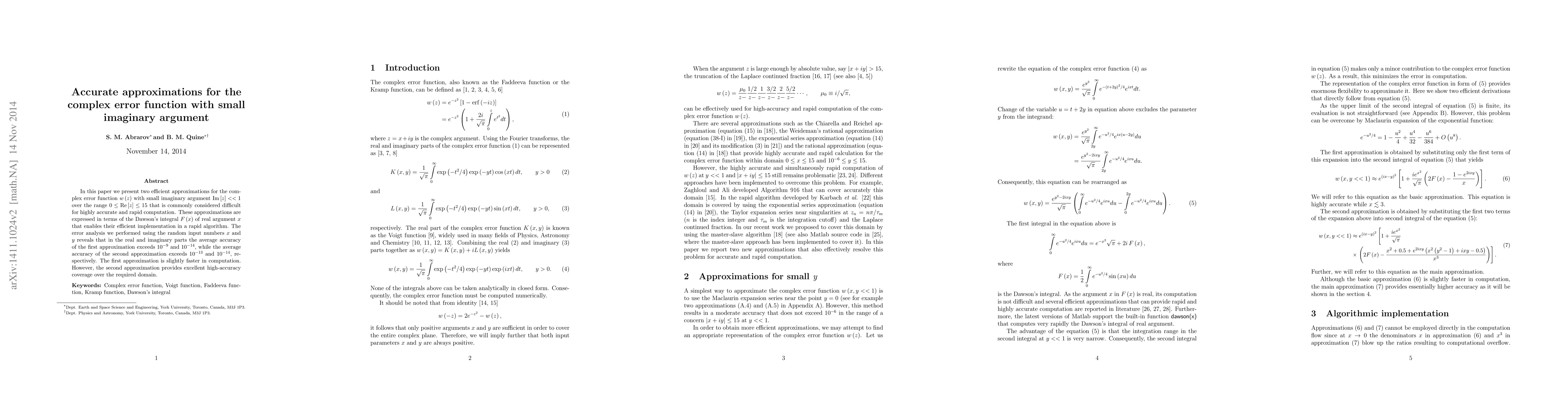 This paper introduces two efficient approximations for the complex error function $w(z)$ with small imaginary arguments, expressed in terms of Dawson's integral. The first approximation is faster but less accurate, while the second offers higher accuracy at a slightly higher computational cost.