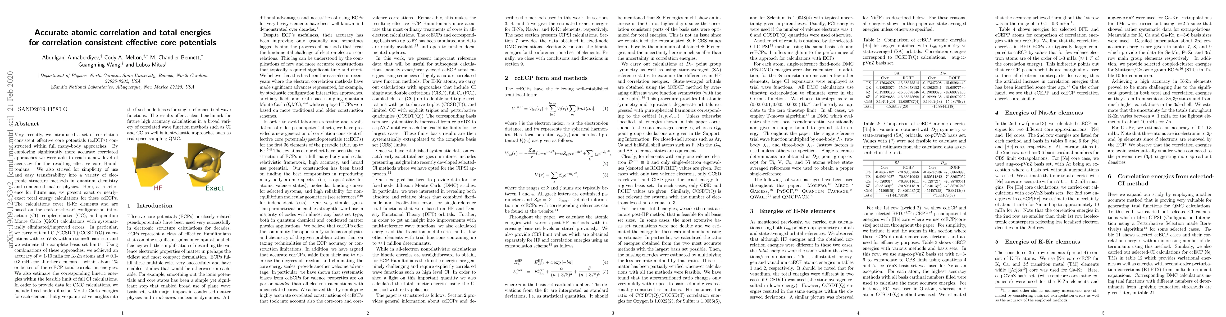 Very recently, we introduced a set of correlation consistent effective core potentials (ccECPs) constructed within full many-body approaches. By employing significantly more accurate correlated approaches we were able to reach a new level of accuracy for the resulting effective core Hamiltonians. We also strived for simplicity of use and easy transferability into a variety of electronic structure methods in quantum chemistry and condensed matter physics. Here, as a reference for future use, we present exact or nearly-exact total energy calculations for these ccECPs. The calculations cover H-Kr elements and are based on the state-of-the-art configuration interaction (CI), coupled-cluster (CC), and quantum Monte Carlo (QMC) calculations with systematically eliminated/improved errors. In particular, we carry out full CI/CCSD(T)/CCSDT(Q) calculations with cc-pVnZ with up to n=6 basis sets and we estimate the complete basis set limits. Using combinations of these approaches, we achieved an accuracy of $\approx$ 1-10 mHa for K-Zn atoms and $\approx$ 0.1-0.3 mHa for all other elements $-$ within about 1% or better of the ccECP total correlation energies. We also estimate the corresponding kinetic energies within the feasible limit of full CI calculations. In order to provide data for QMC calculations, we include fixed-node diffusion Monte Carlo energies for each element that give quantitative insights into the fixed-node biases for single-reference trial wave functions. The results offer a clear benchmark for future high accuracy calculations in a broad variety of correlated wave function methods such as CI and CC as well is in stochastic approaches such as real space sampling QMC.
