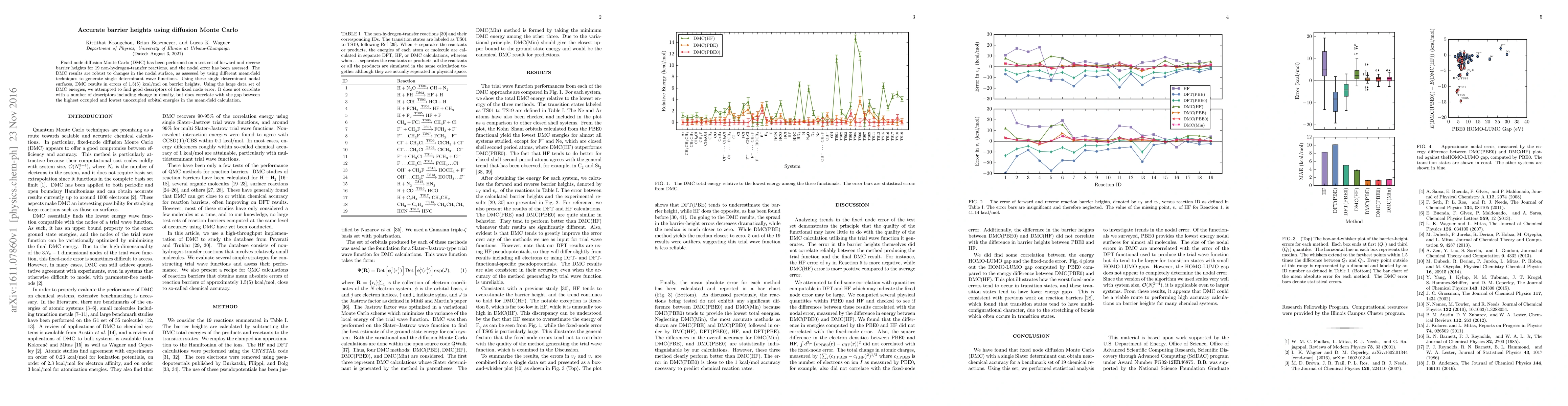 This paper reports on the application of fixed node diffusion Monte Carlo (DMC) to determine barrier heights for 19 non-hydrogen-transfer reactions, finding robust results with errors of 1.5(5) kcal/mol. The nodal error does not correlate with changes in density but correlates with the gap between the highest occupied and lowest unoccupied orbital energies.